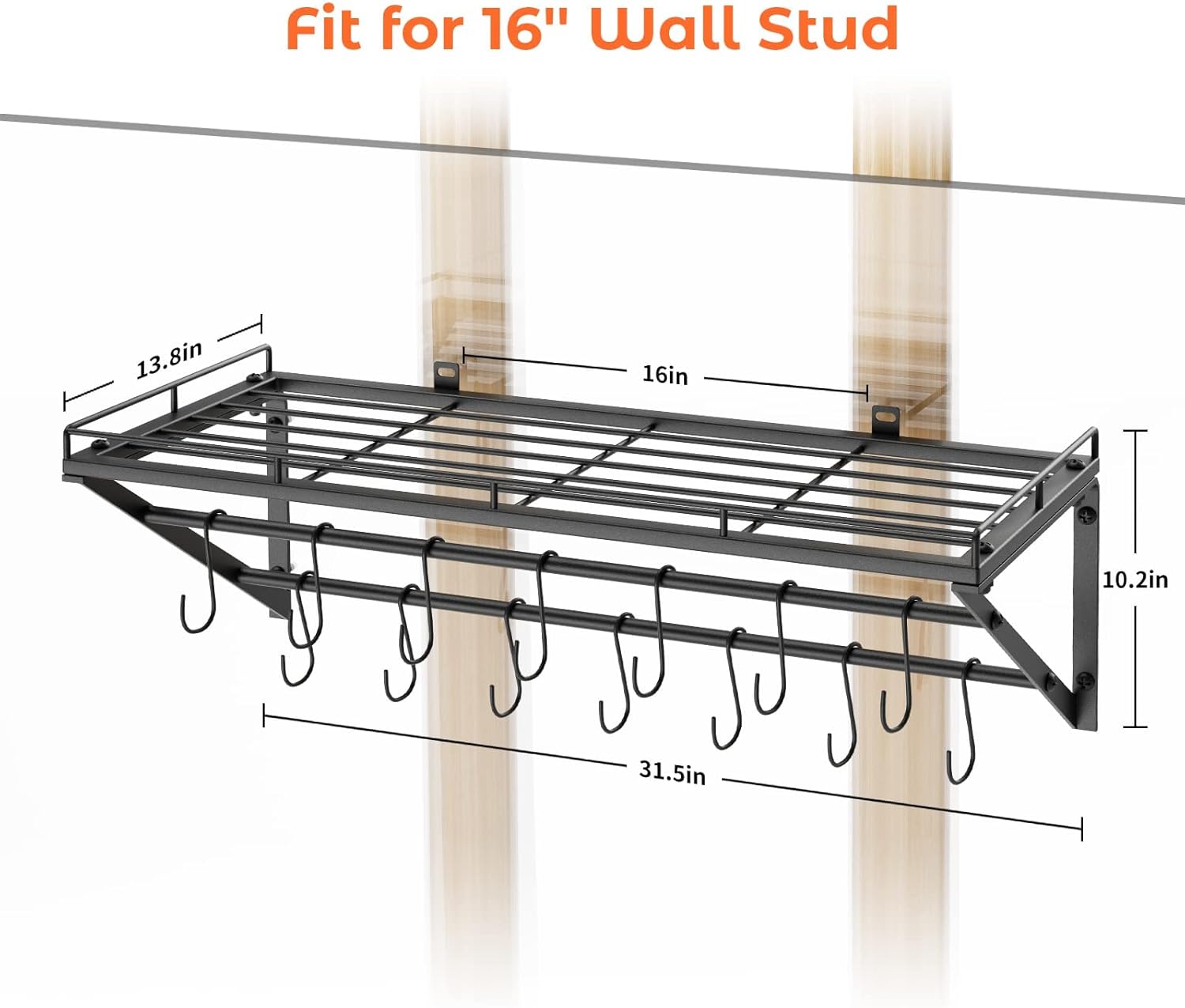 - Ample Storage Capacity - Dimensions of 31.5 inch X 13.8 inch X 10.2 inch (L x W x H) with 14 movable hooks and a maximum load capacity of 130 pounds. This pan hanger accommodates everything from air fryers and microwaves to heavy stockpots on large shelf with ample space