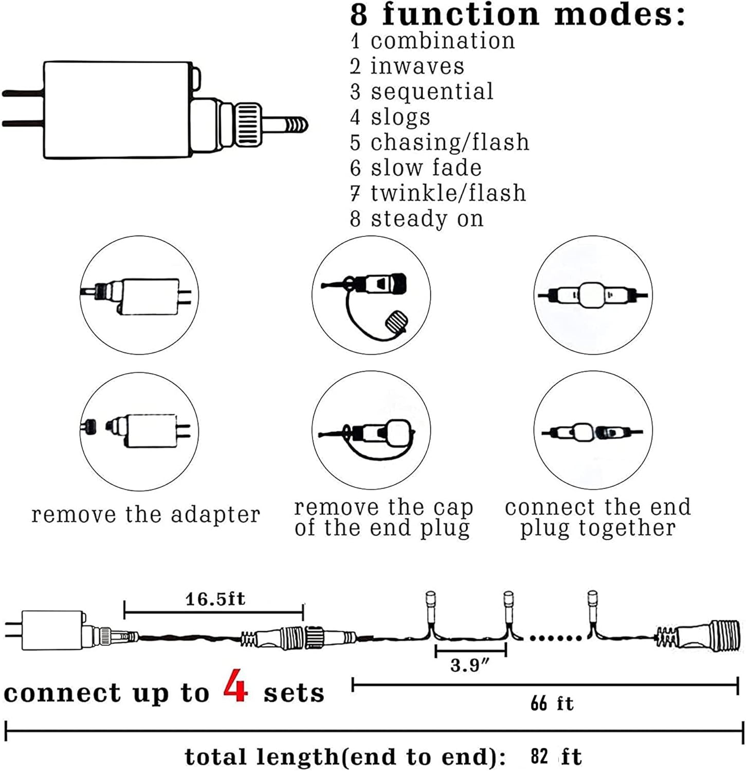 - Halloween Decorations String Lights: 66 ft string lights with 200 purple & orange individual LED bulbs, the lead wire is 16.5 feet, total length is 82.5 ft, and the bulb spacing is 3.9 inches. Each string lights has end-to-end connection, you can connect up to 4 sets together to illuminate a wider range, available for different decorative use.