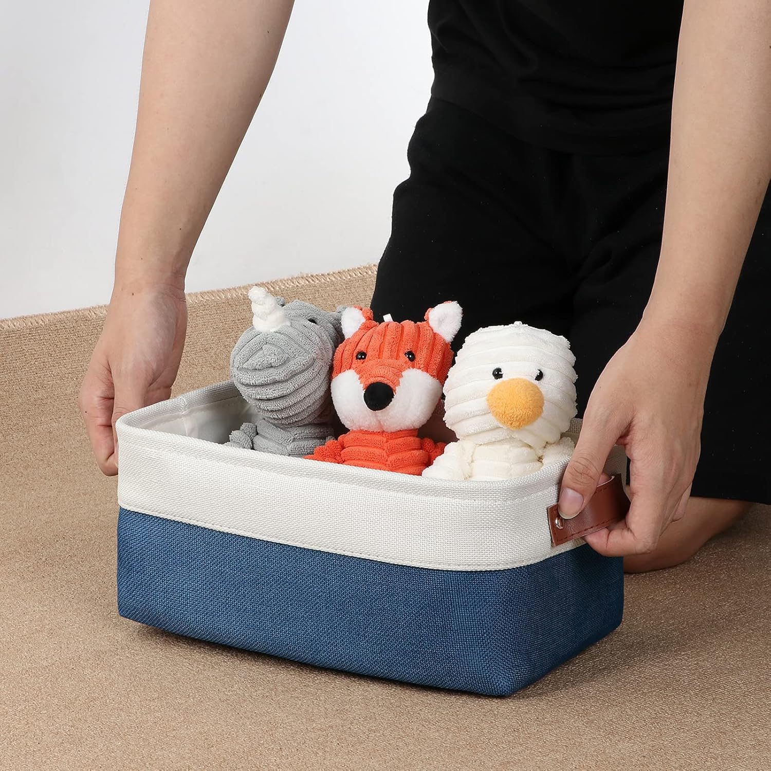 DULLEMELO Set of 6 Small Baskets for Organizing, Small Fabric Storage Bins for Toys Storage, Collapsible Storage Bins with Leather Handles for Shelves, Closets, Laundry, Nursery(White&Blue)