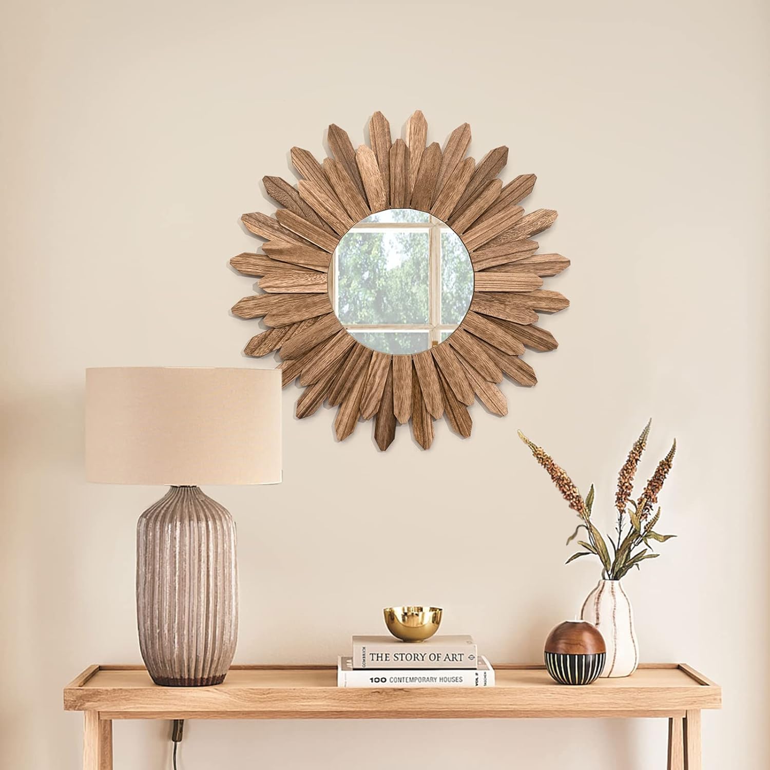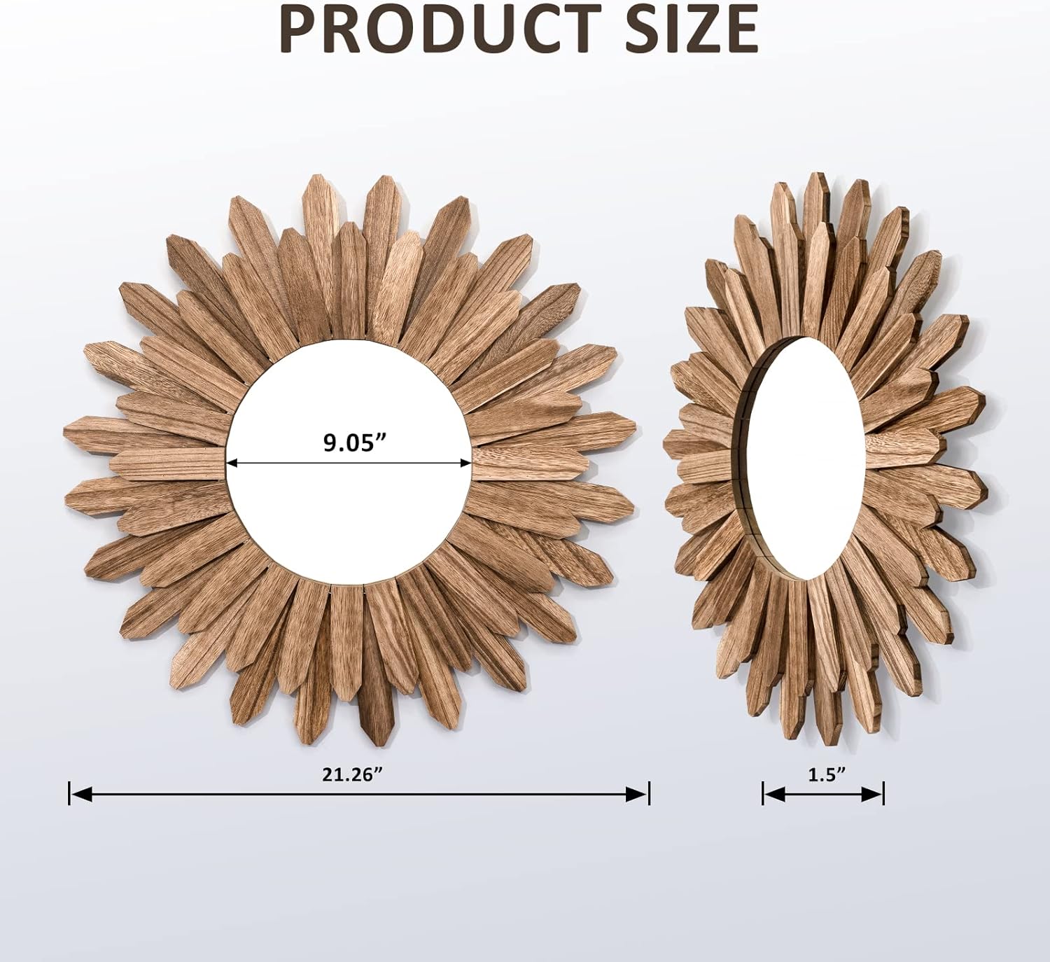 - Easy to Hang: Measure at 21 inch diameter with wood frame and diameter of 9 inch for mirror; Hang this stunning mirror in your bedroom over your bed, in your hallway or entryway, over your living room sofa.No any assembly, quite easy to hang on the wall; Comes with anchor and screw