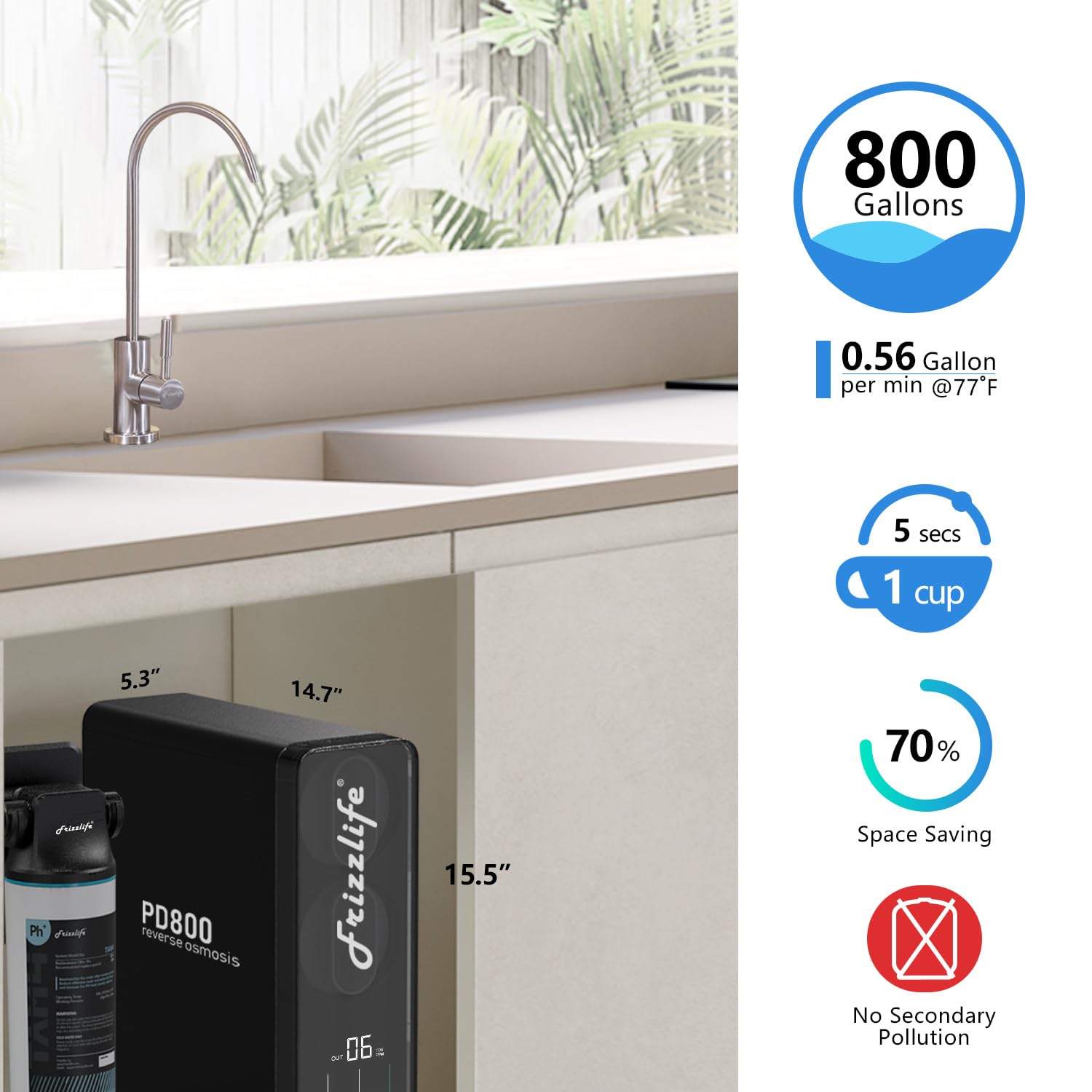 - 【Tankless, No Secondary Pollution】Frizzlife PD800-TAM4 RO water filter system with Tankless design prevents potential secondary contaminants brought by the pressure tank. The built-in pump guarantees the RO water running out from the dedicated faucet is fresh and on demand! Meanwhile, it saves at least 70% under sink space. The integrated design comes with less connection point, the installation is DIY friendly and can be done in a few minutes with the straightforward guide video.