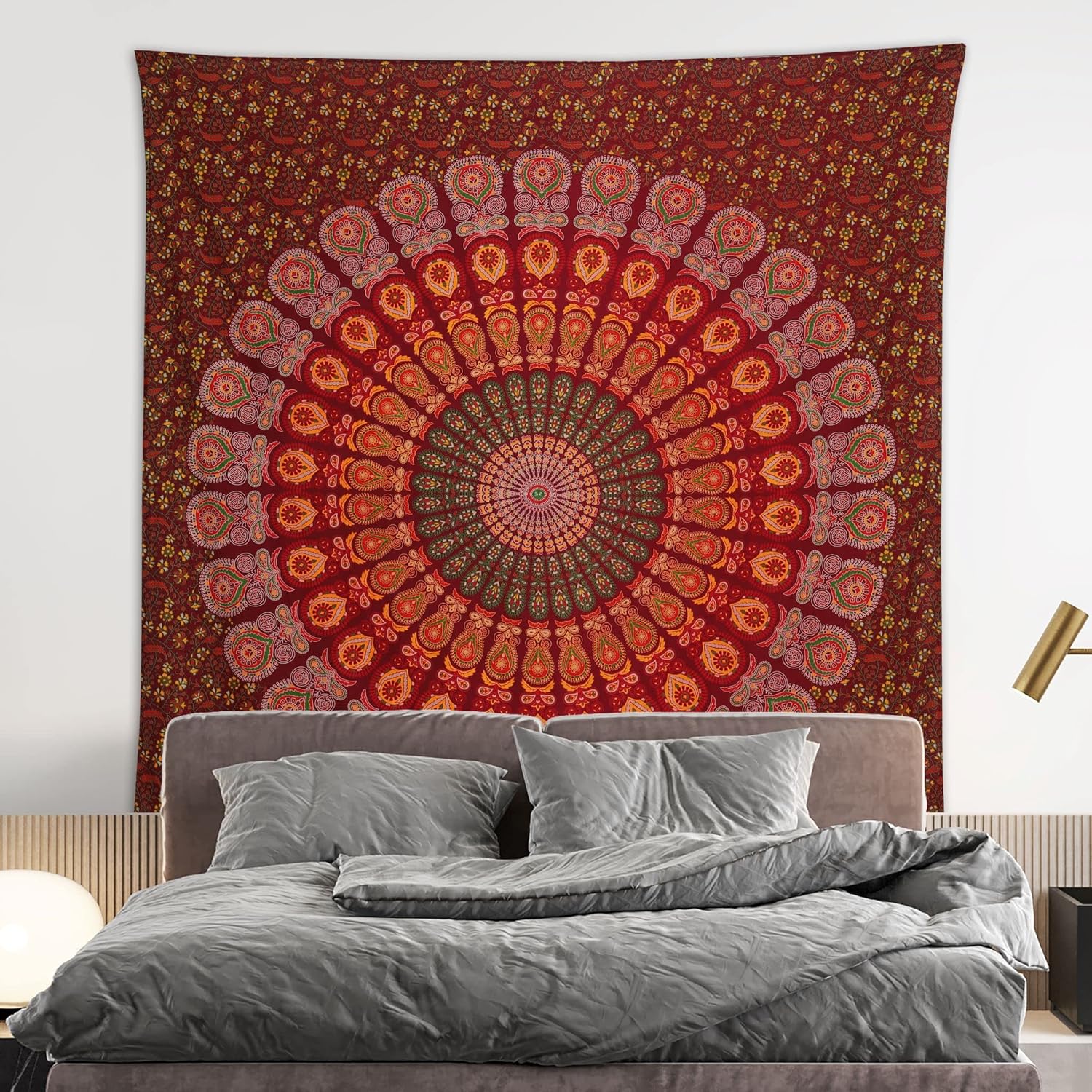 Bless International Handmade Indian hippie Bohemian Psychedelic Peacock Mandala Wall hanging College Dorm Beach Throws Table Cloth Bedding Tapestry (Maroon Yellow, King(88x104Inches)(225x265Cms))