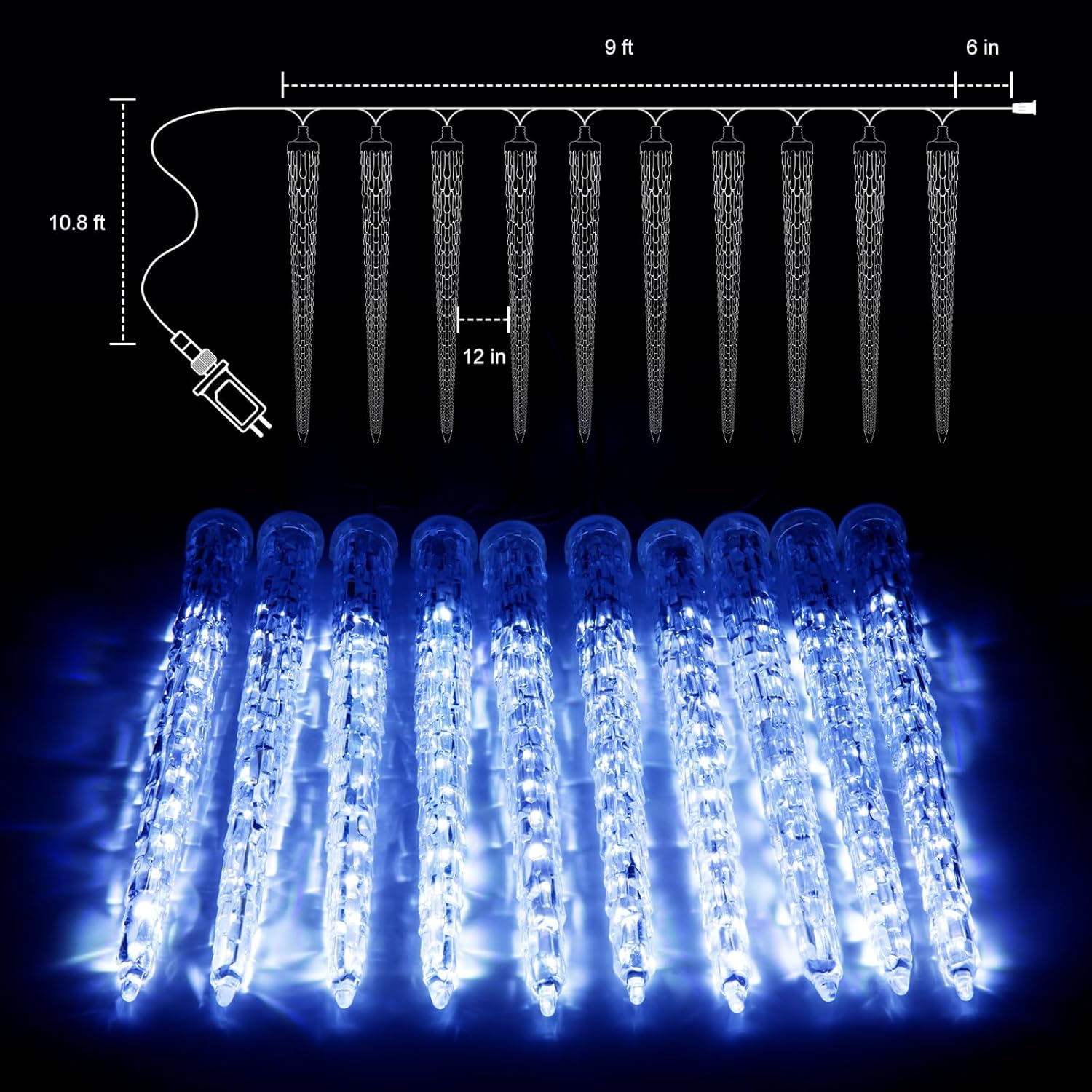 - 【Crystal Christmas Icicle Lights】Bring a classic ice crystal design to your home with 11-inch artificial icicles. With 10 tubes and a total of 240 icy blue LEDs, these lights create a winter wonderland in your front yard or garden- perfect for Christmas;