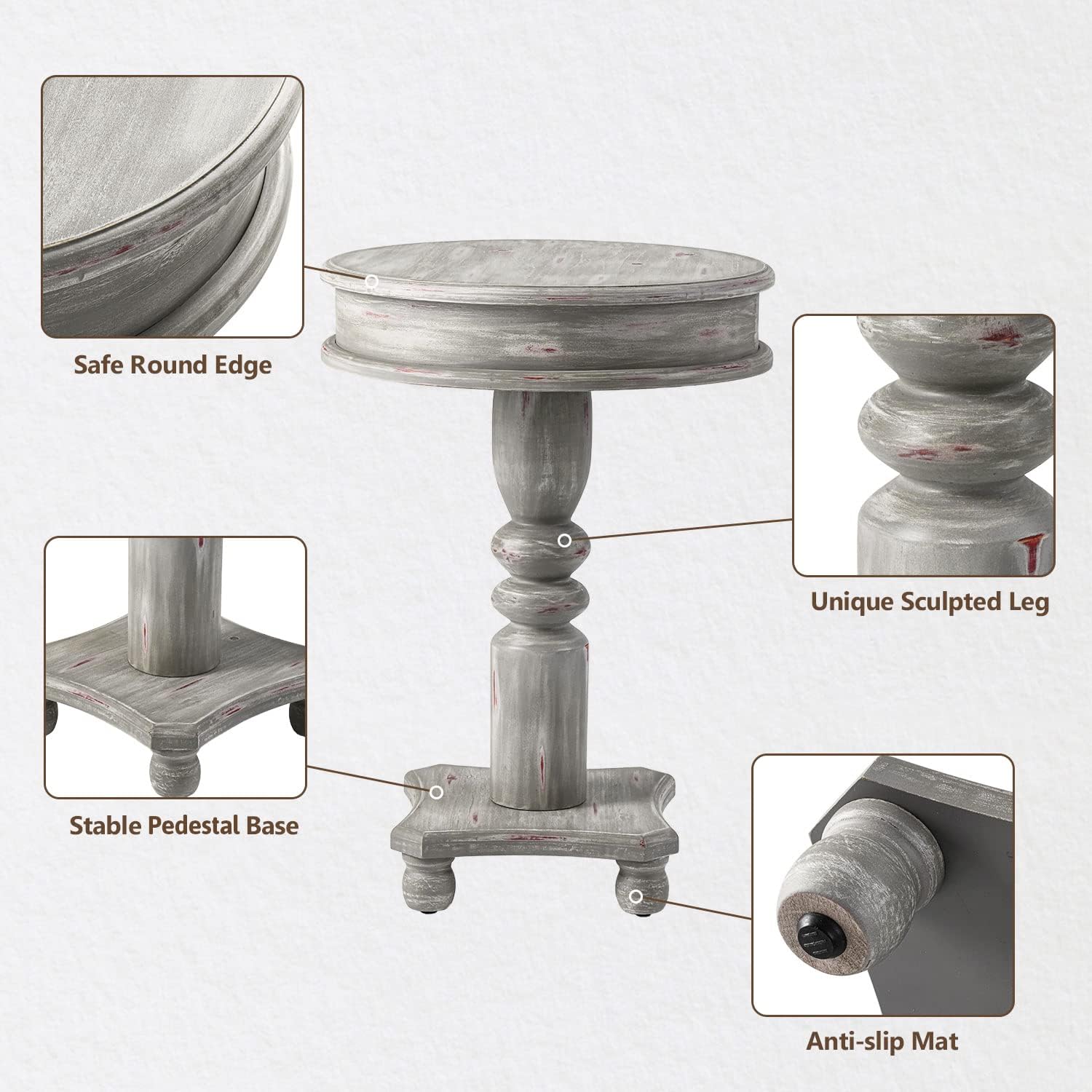 COSIEST Rustic Accent Side Table, Farmhouse Wood Pedestal Table Round End Table for Living Room, Bedroom, Distressed Whitewash Finish, Grey Color