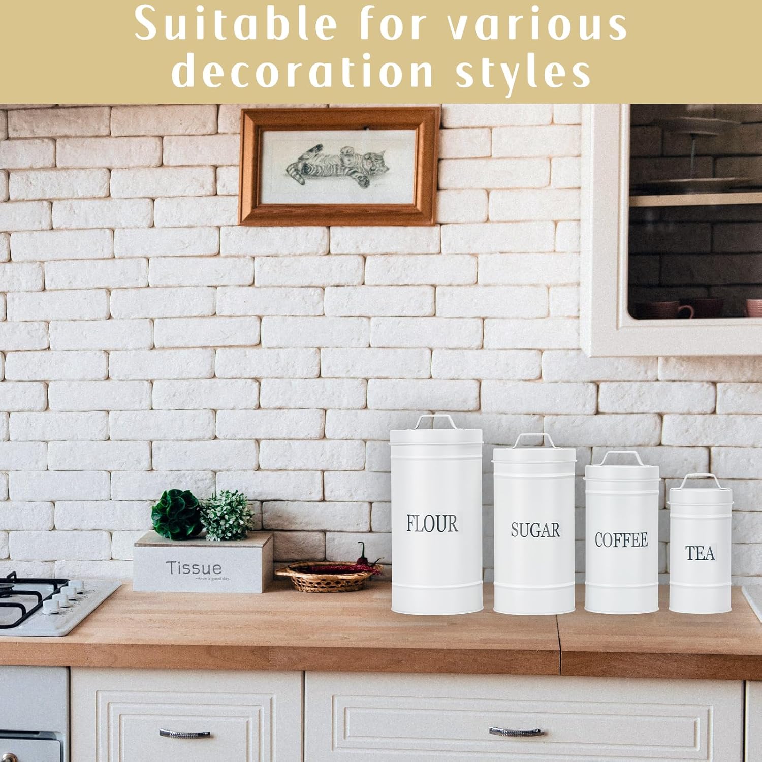 Farmhouse Canister Set for Kitchen Countertop, Airtight Nesting Kitchen Canisters Set of 4, Mental Flour Sugar Coffee Tea Storage Canister Jars, Vintage Country Design, White