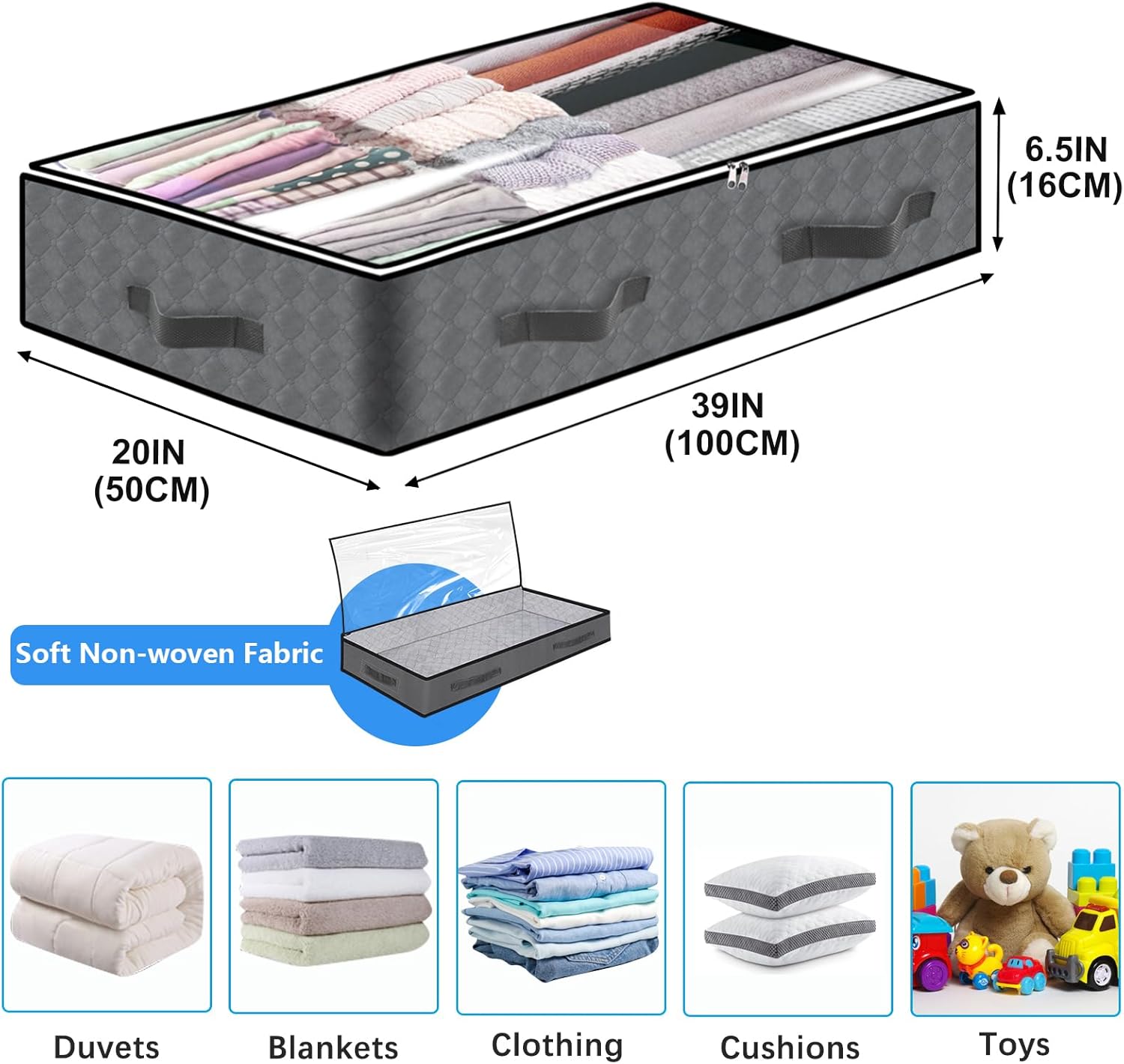 - 【Reinforced Handles】The wide handles of the underbed storage containers are double-stitched with thick fabric, sturdy enough to pulling out from underbed and moving in your house, reliable for long time use.