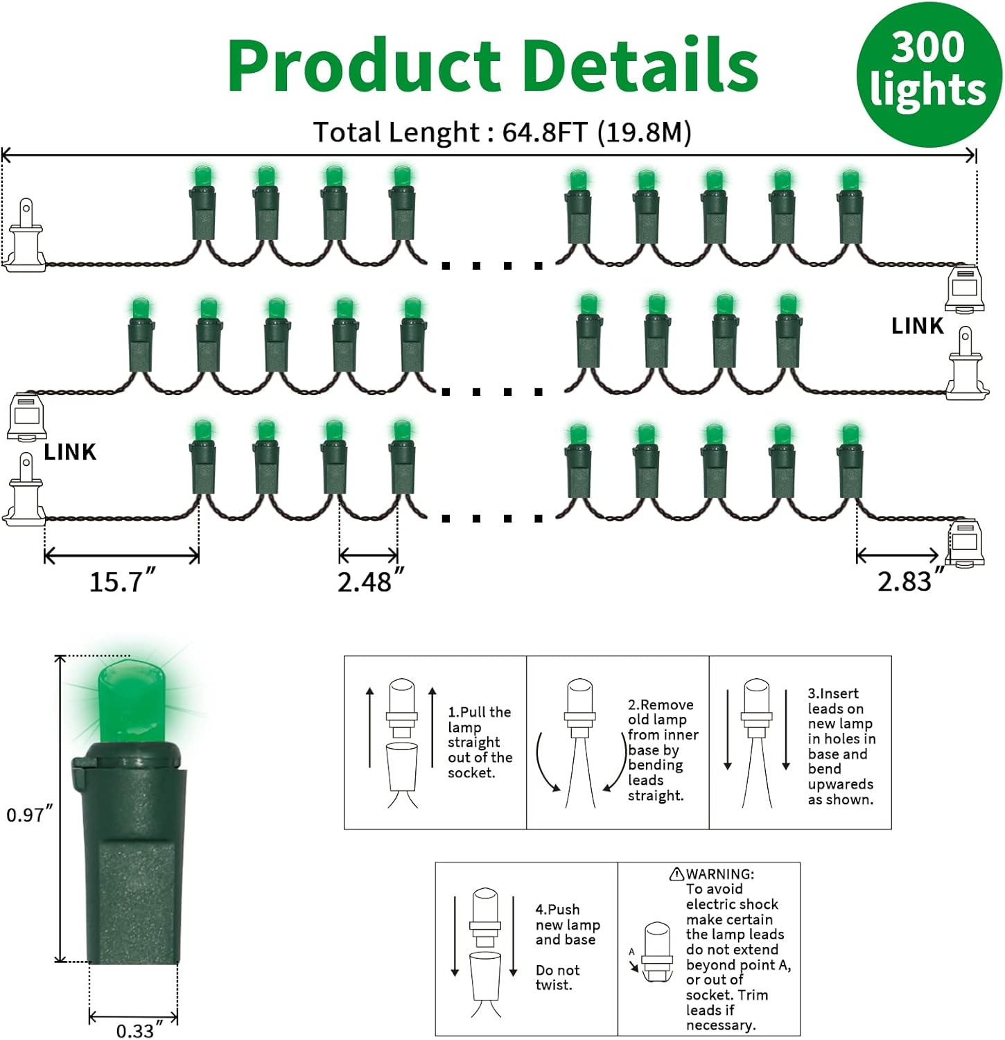 - 3 STRANDS IN 1 PACK: 64.8ft 300 LED Lights (100 Lights 21.6ft 3 Groups), 5mm wide angle stable LED string lights spaced 6.3 inches apart with green wire.