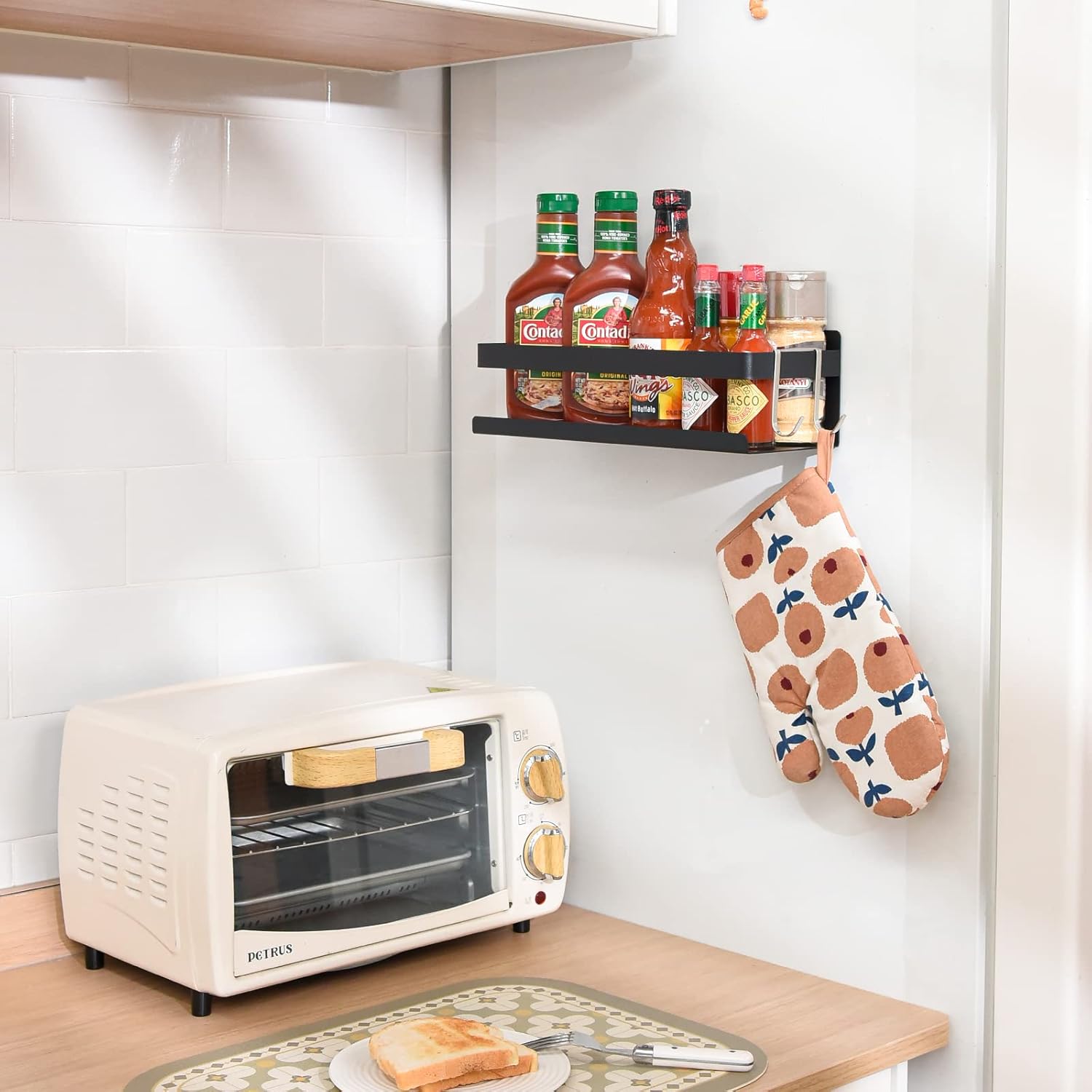 - 【Super large capacity】The guardrails around the edge providing a large storage capacity. It can easily store kitchen condiments and kitchen tools: spice jars, pepper, salt, sugar, a jar of olive oil, as well as skin care products, toiletries, etc