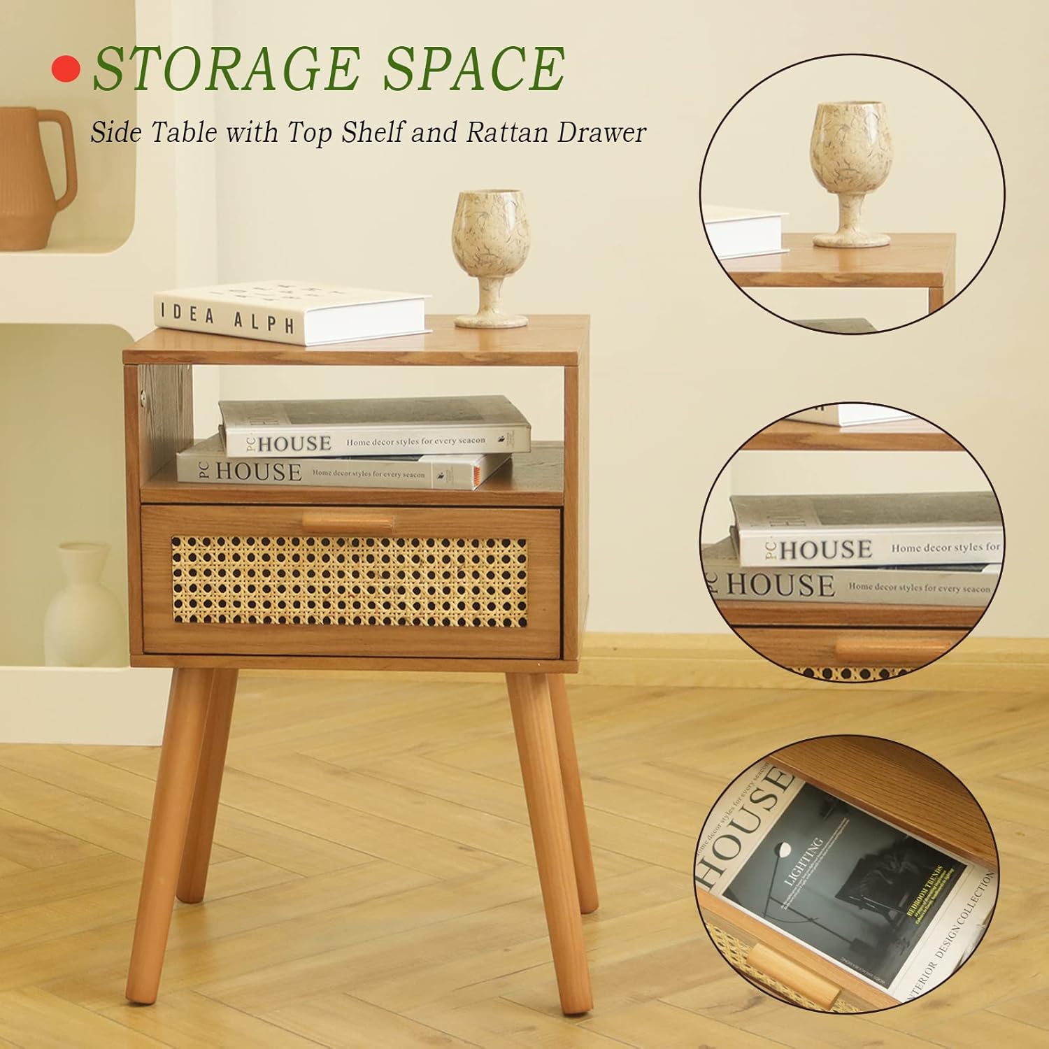 MaxSmeo Mid Century Modern Nightstand with Drawer, Small Nightstand Bedside Table, Rattan Nightstand, Wood End Table for Bedroom, Living Room (Brown)