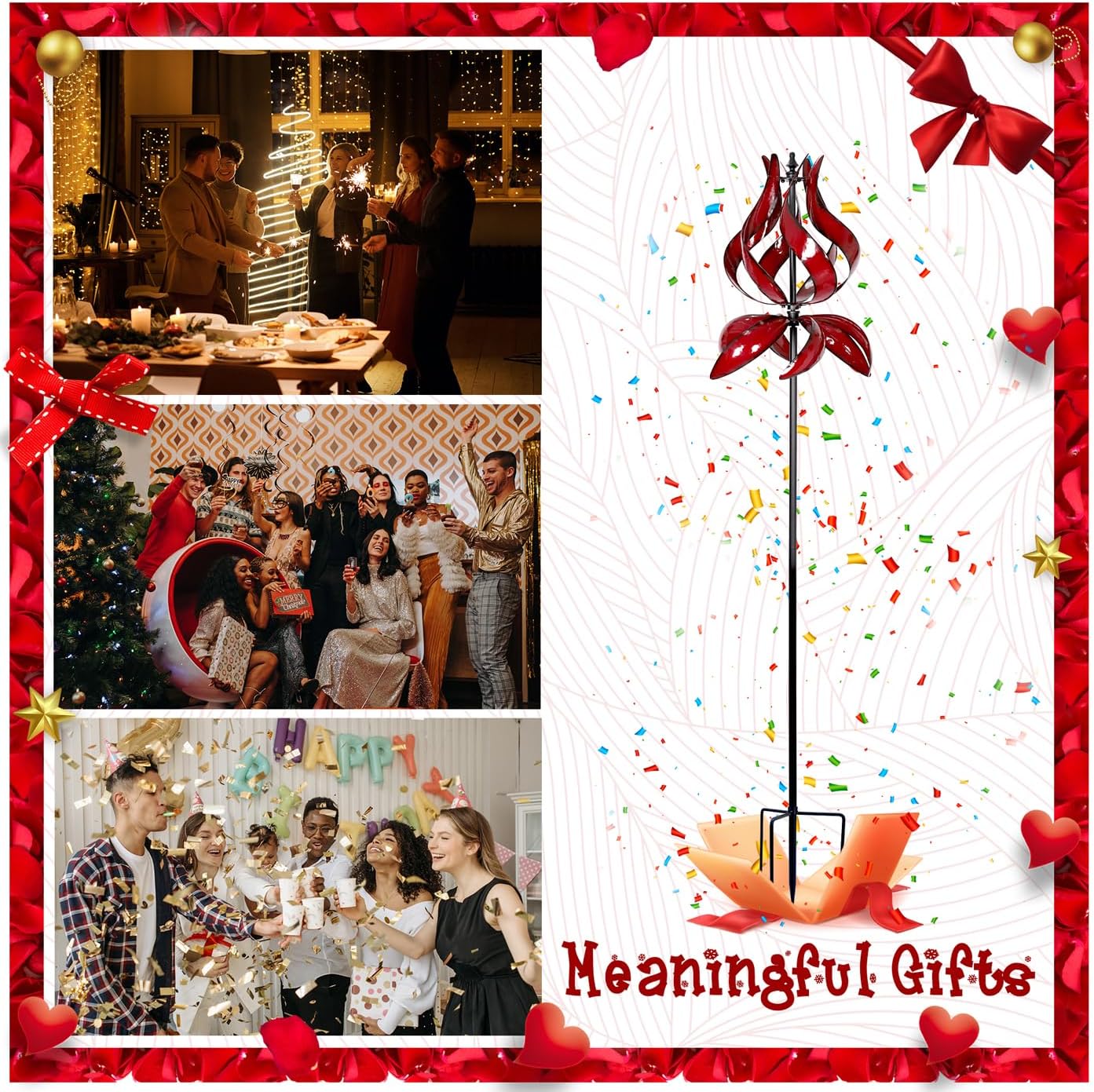 - 【Graceful Burgundy Tulip Wind Spinner】Beautify your outdoor space with this attractive kinetic wind spinner, featuring two layered shinning tulip & leaves. Crafted in painted bright red color, the blades capture and reflect sunlight mesmerizingly and creating attractive movement display. Its timeless rotating design adds vivid motion, transforming your yard into an attractive and peaceful art space.