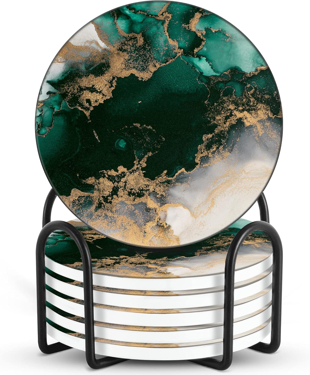 Emerson Coasters for Drinks Absorbent – Natural Stone Drink Coasters Set with Holder, Coasters for Coffee Table, Wooden Tabletop Protection Marble Style – 100% Heavy Duty Set of 6 (Green Forest)