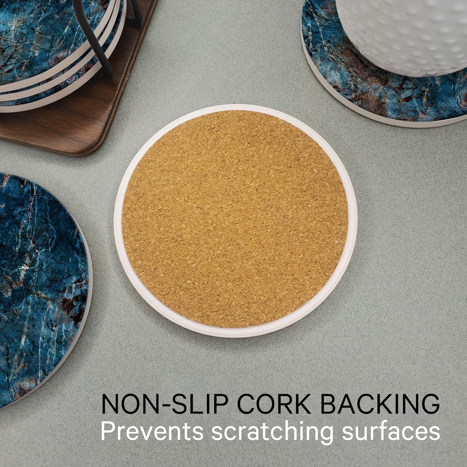 Emerson Coasters for Drinks Absorbent – Natural Stone Drink Coasters Set with Holder, Coasters for Coffee Table, Wooden Tabletop Protection Marble Style – 100% Heavy Duty Set of 6 (Deep Ocean)