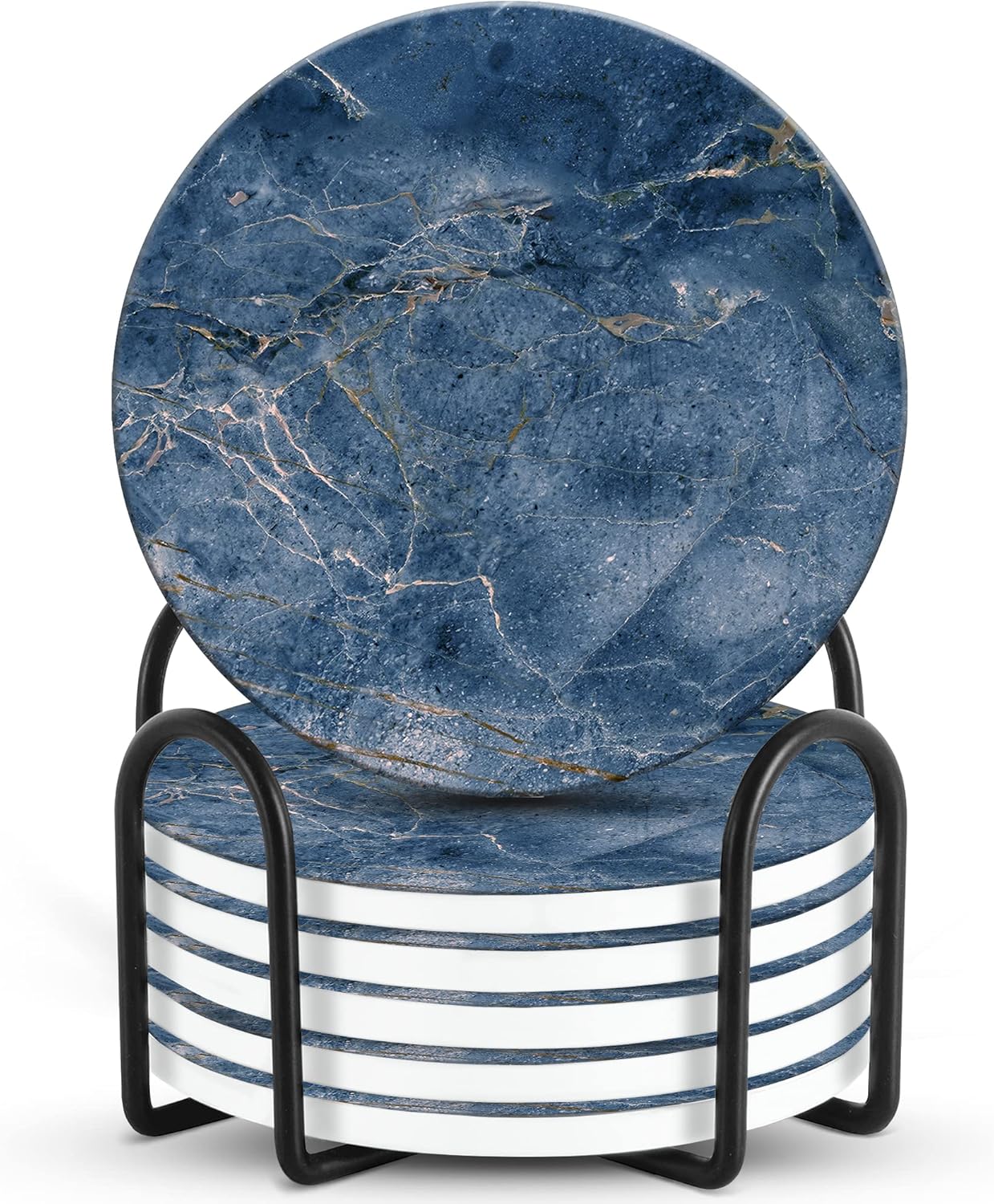 Emerson Coasters for Drinks Absorbent Set of 6 with Holder – Marble Style Coasters – Coasters for Drinks – Drink Coasters for Coffee Table – 100% Ceramic Stone Non Slip – Heavy Duty (Ocean)