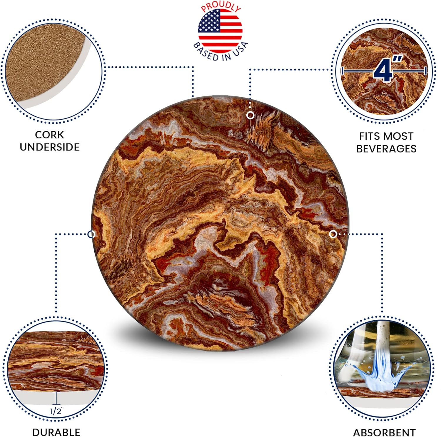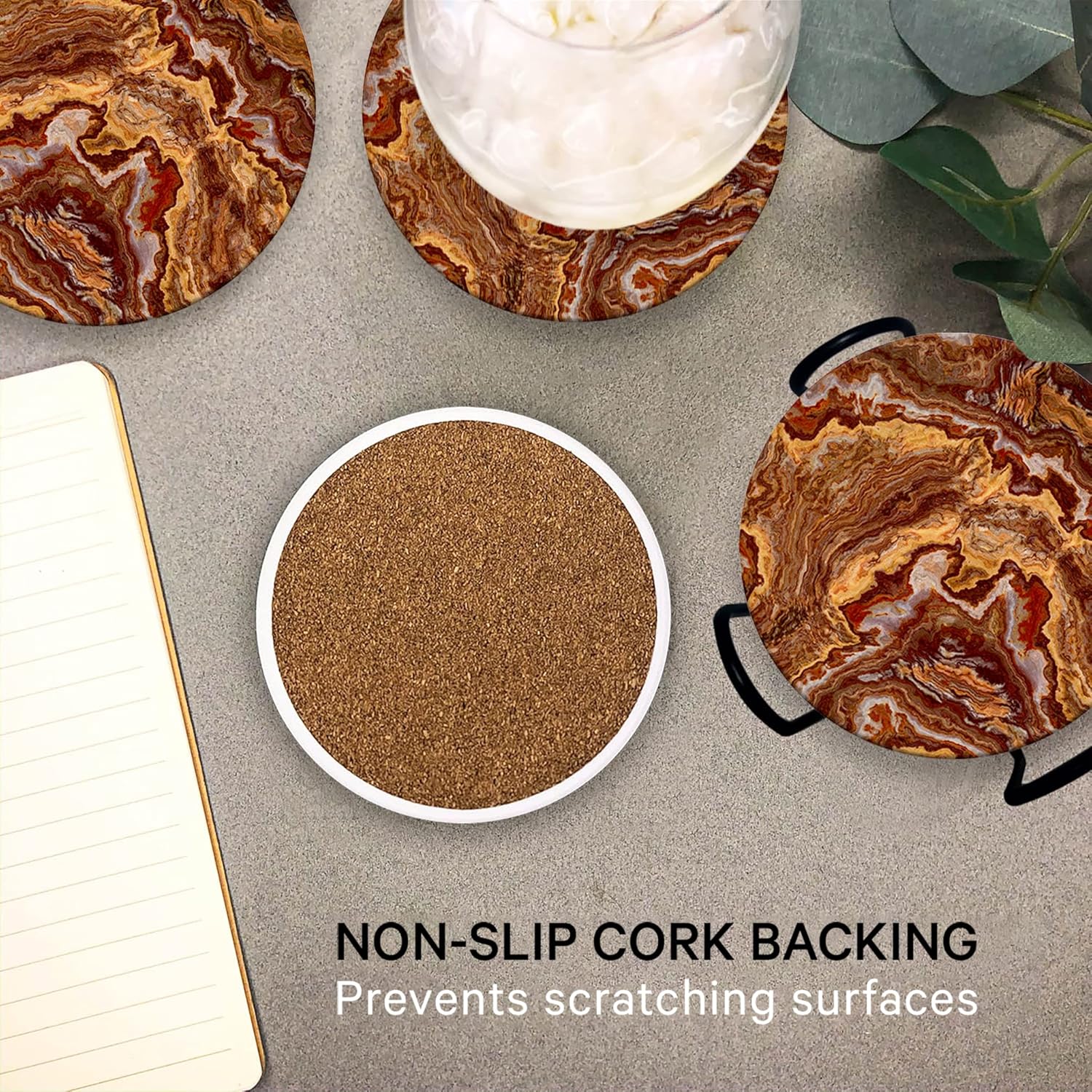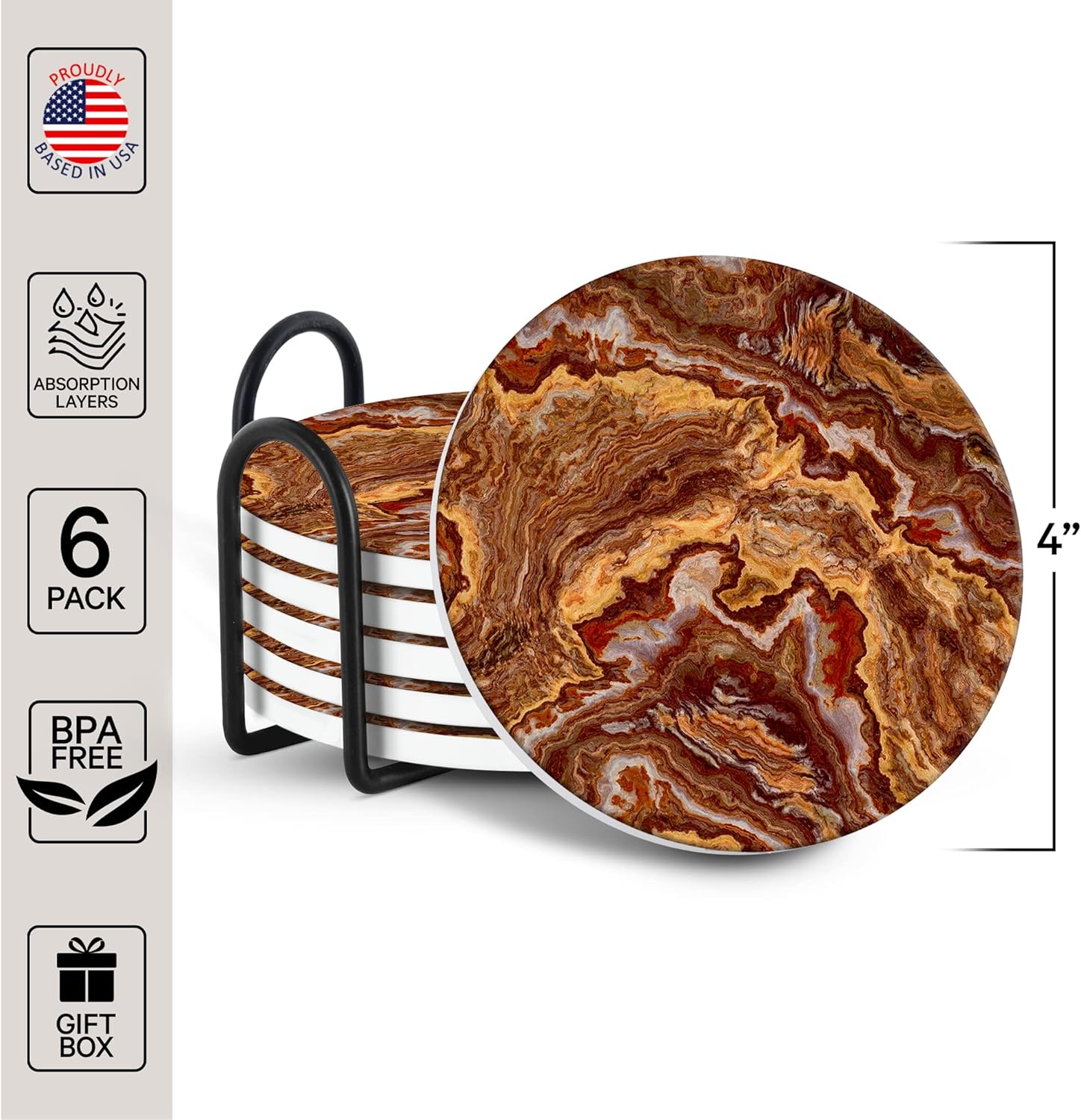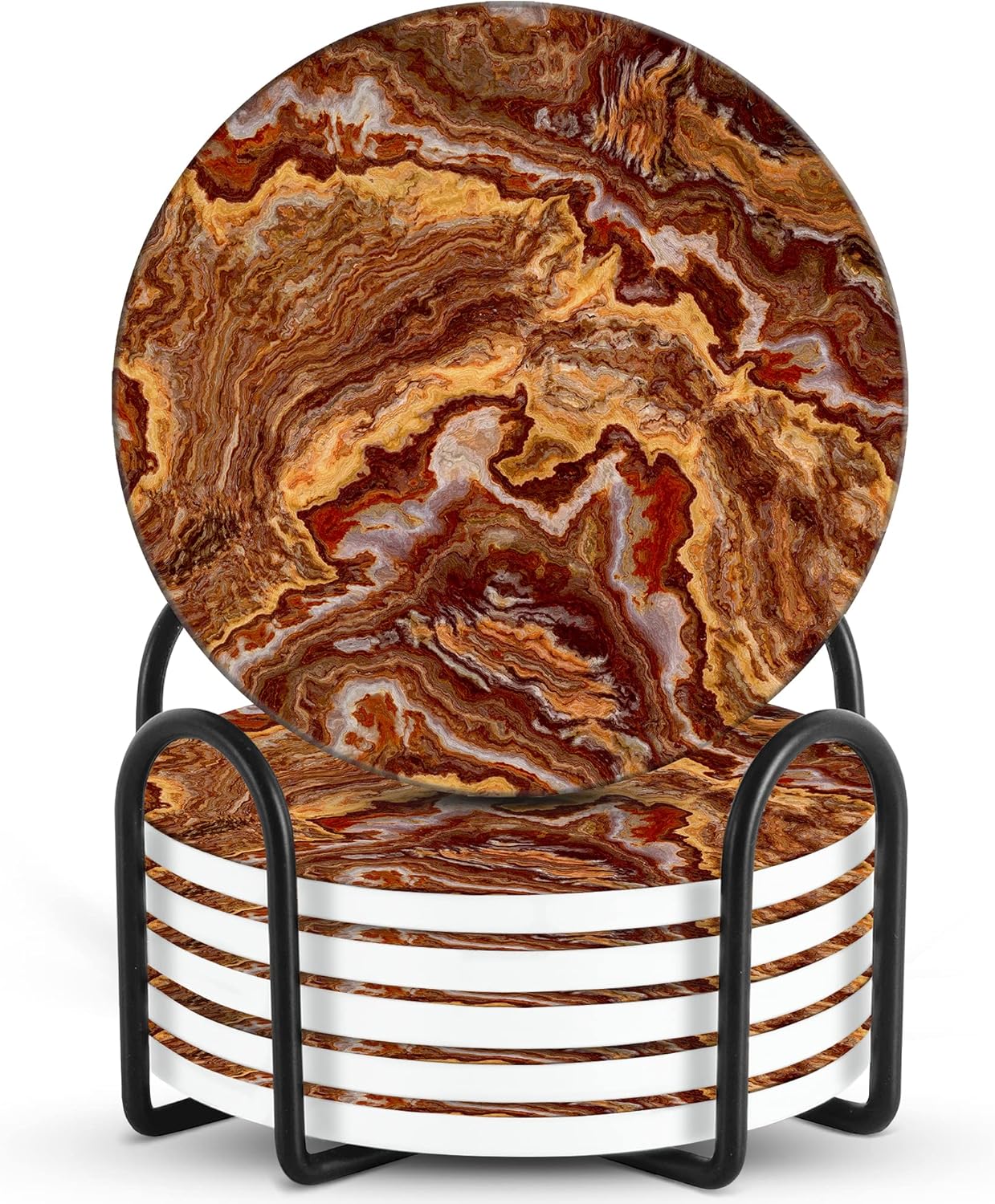 Emerson Coasters for Drinks Absorbent Set of 6 with Holder – Marble Style Coasters – Coasters for Drinks – Drink Coasters for Coffee Table – 100% Ceramic Stone Non Slip – Heavy Duty (Ember)