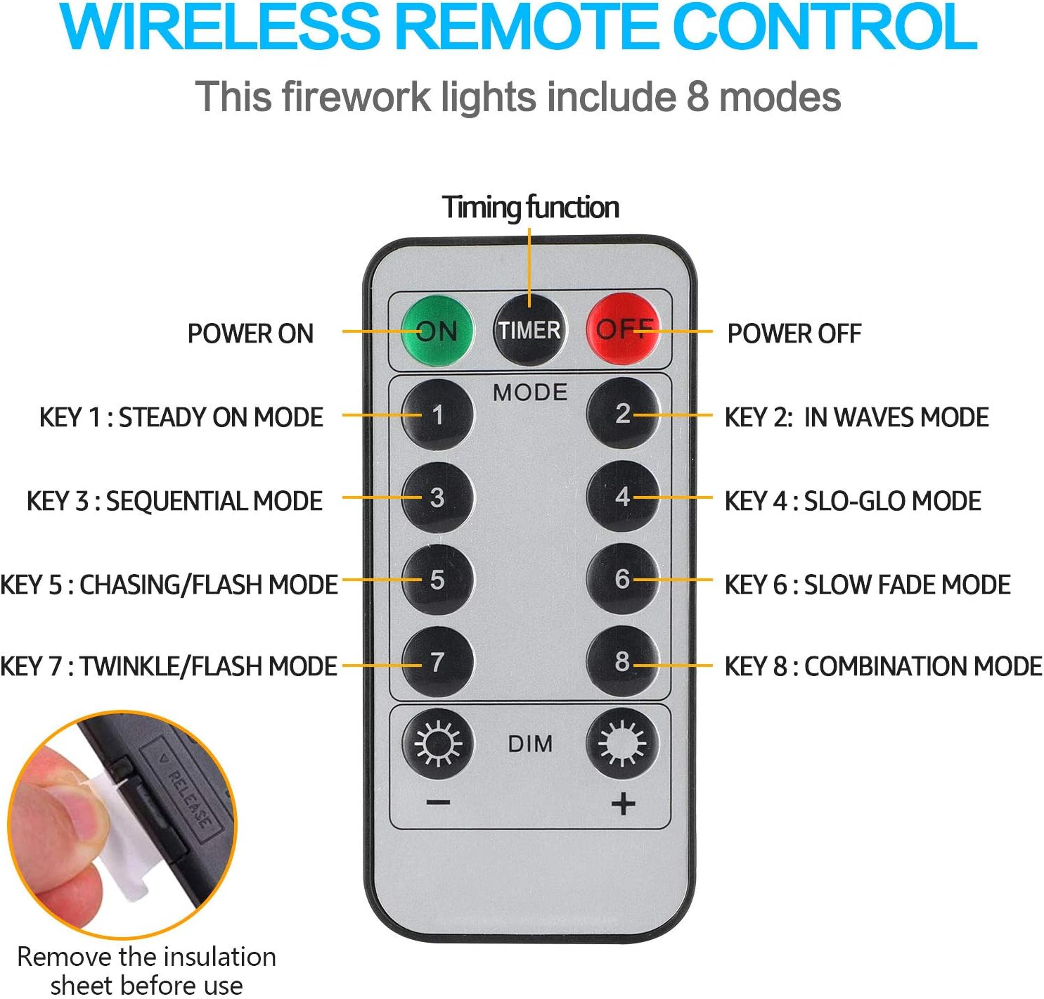 - 【8 Modes Remote】:This firework lights include 8 modes:①. Steady on ②.In Waves ③.Sequential ④.Slow-Glow ⑤.Chasing/Flash ⑥.Slow Fade ⑦.Twinkle/Flash ⑧.Combination. You can set your favorite firework light lamp mode in different scenes. Control method: ①Remote control (When you are using the remote controller you need to use the controller to point the power supply); ②Button on the Power Supply.