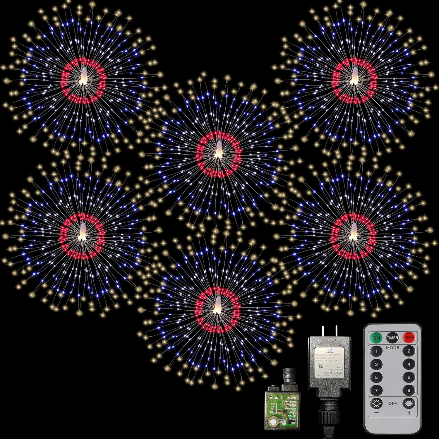 Firework Lights 6 Pack 180 LED Copper Wire Starburst With 8 Models, Power Supply Fairy With Remote Control, Waterproof Outdoor Hanging