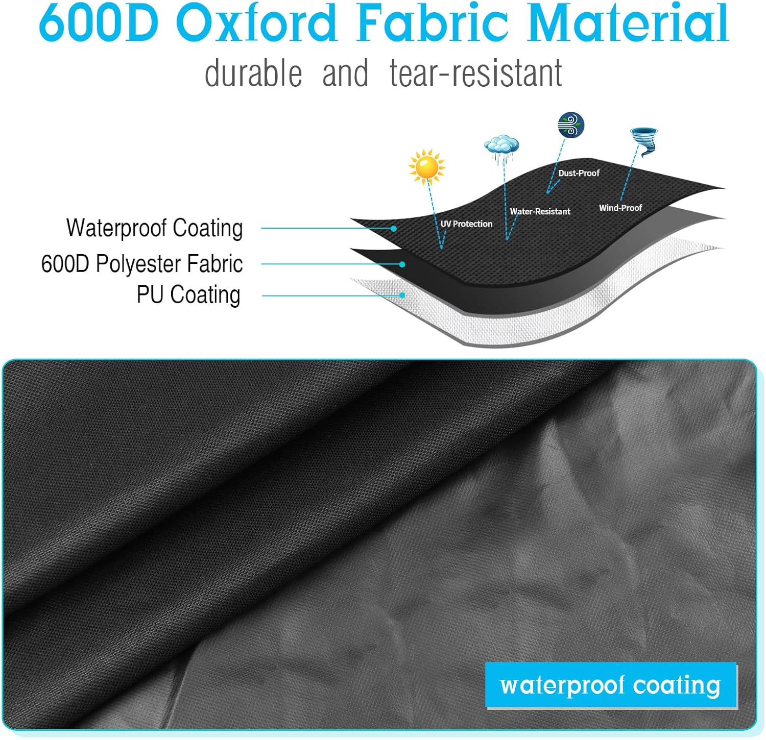 - Premium Material: Made of 600D Oxford fabric, waterproof and tear-resistant, with extra waterproof strips at the seams to prevent water from seeping through the seams, keeping the furniture dry and clean.