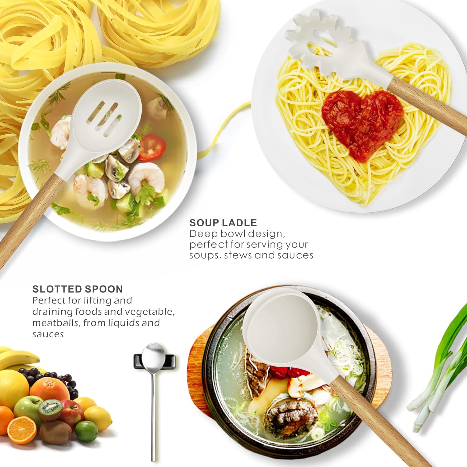 Silicone Cooking Utensils Set - 446°F Heat Resistant Silicone Kitchen Utensils for Cooking,Kitchen Utensil Spatula Set w Wooden Handles and Holder for Non-Stick Cookware, BPA FREE (Cream White)