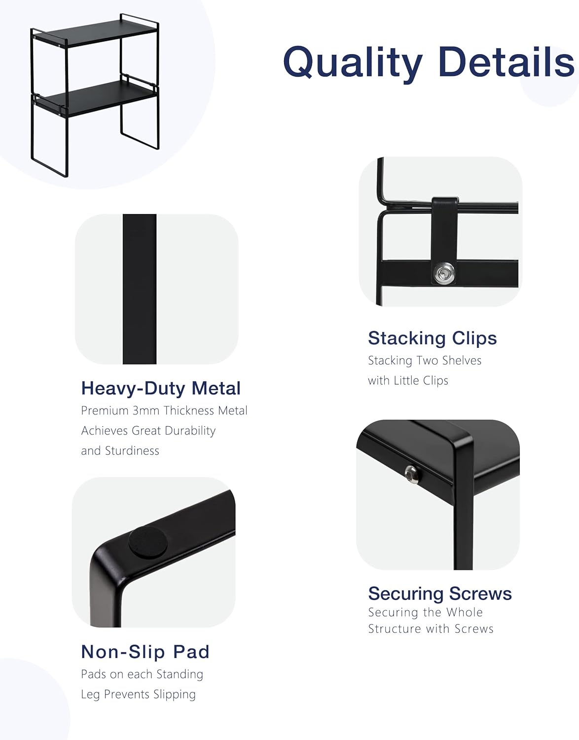 - STACKABLE: The product comes with two sets of cabinet shelves where you can stack one on top of another, creating 2-tiers double space to store household items under, in between or on the shelf. They are perfect to use as storage organizers in kitchen, cabinet, pantry, cupboard, and anywhere in your home or office for that wonderful extra storage space.