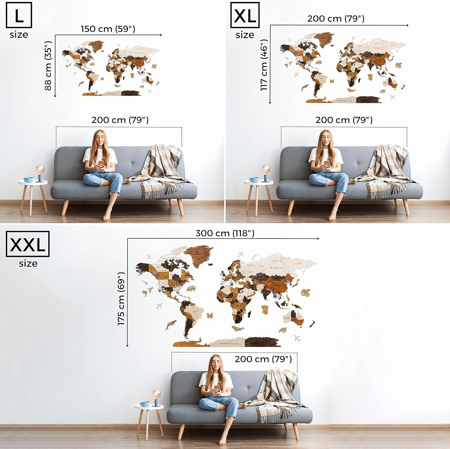 - UNIQUE HANDMADE DECOR: 4 hand-painted colors on our world map (natural, pine, oak, brown) and 4 sizes (M,L,XL, XXL) to achieve the look that best fits your decor style. Made of high-quality basswood with flawless engraving details 3D Wooden World Map is the most amazing decor for any traveler: minimalistic, meaningful, and really inspiring! A wall keepsake saves memories of your trips with family, friends, belove people.