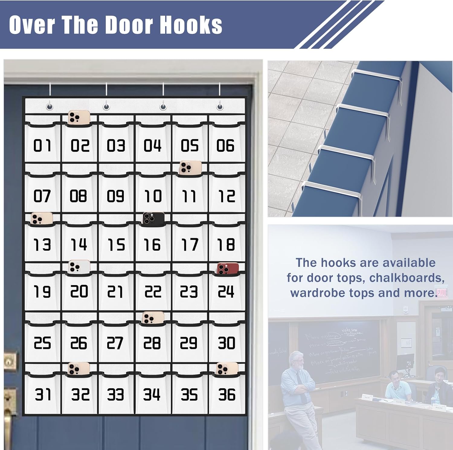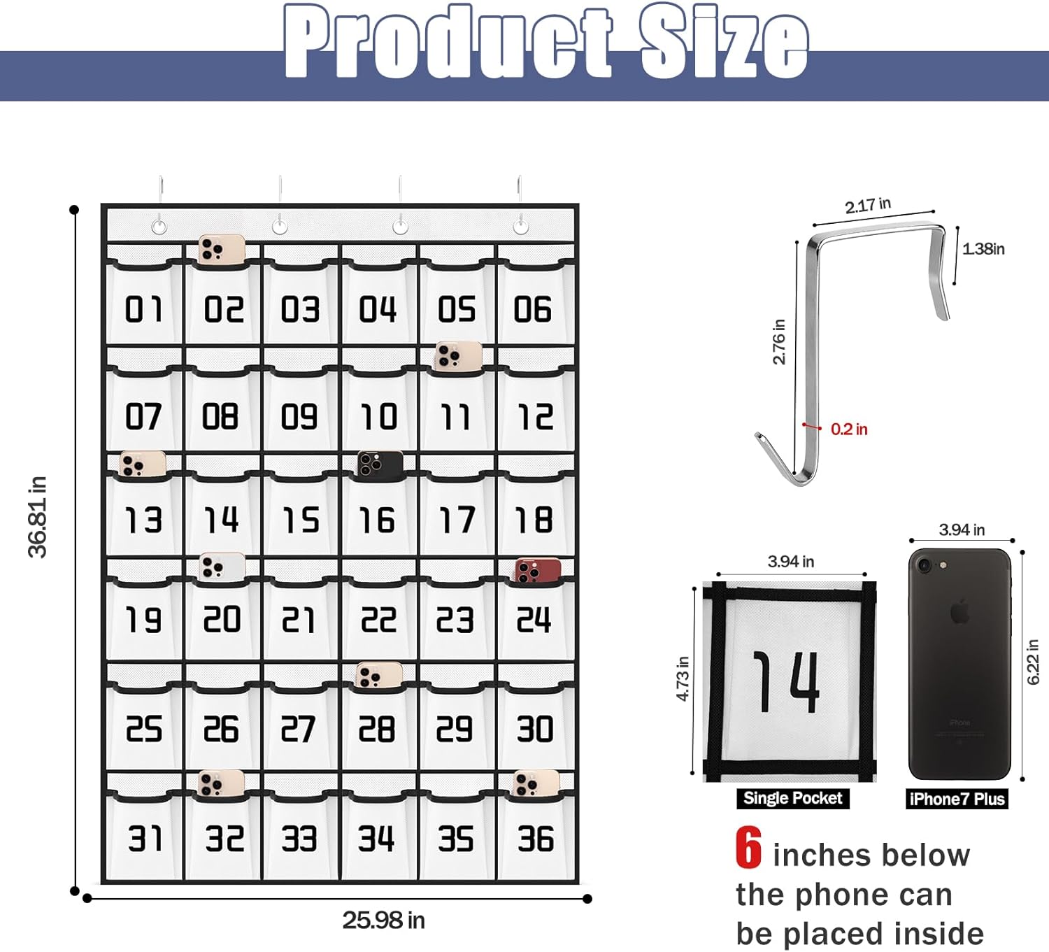 - 【4 Metal Hooks for Classroom Pocket Chart】 Calculator Phone pouch fit the top of whiteboard or over the door as thick as 1.3"-2", hanging organizer with pockets supports the weight of 36 phones (about 24 lb), easy to install and close the door.