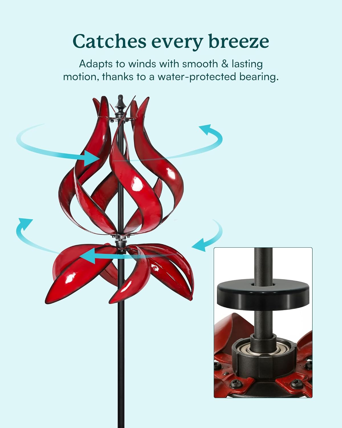 - BEAUTIFUL TULIP DESIGN: This stunning metal yard spinners features a lovely red finish and tulip design. Dual rotors spin independently and rotate 360 degrees. The kinetic yard wind spinners has thickened poles (diameter 22mm, 40% thicker than others) and stable metal stake with three prongs to ensure its firmly planted for windy days and against a snowy landscape.