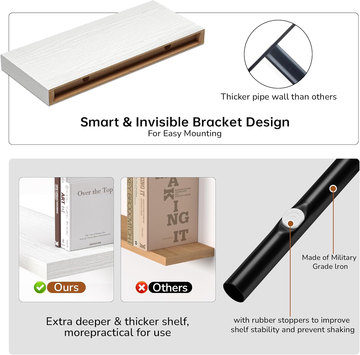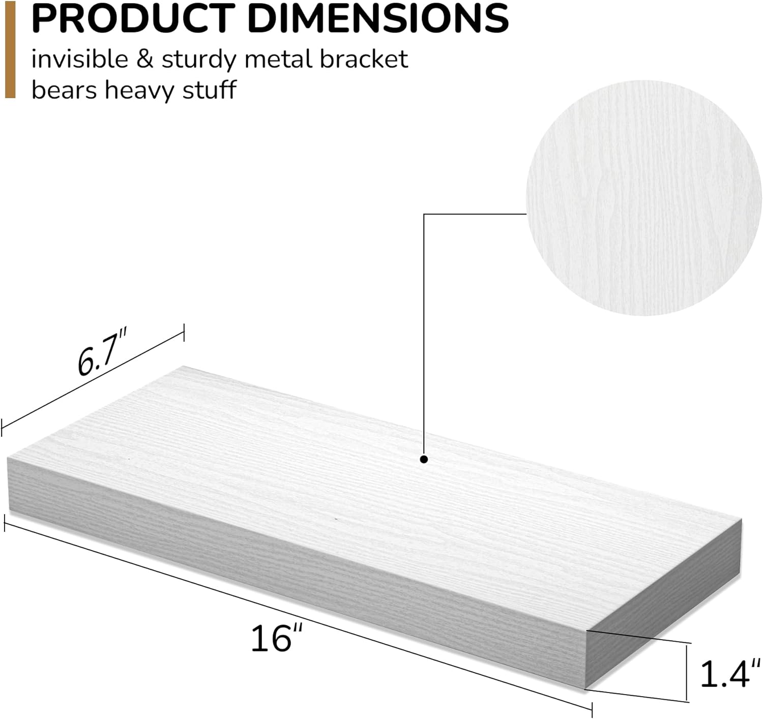 - Extra Deeper & Thicker - Each board measures 16"W x 6.7"D x 1.4"H. Extra deeper and thicker design in order to bring maximizes storage space and weight capacity, even hold up to 30 lb each. This floating shelf taking up zero square feet, reduces clutter and highlights décor in compact spaces.