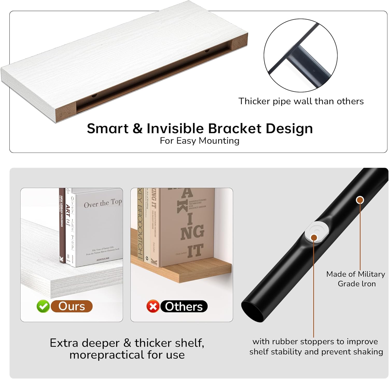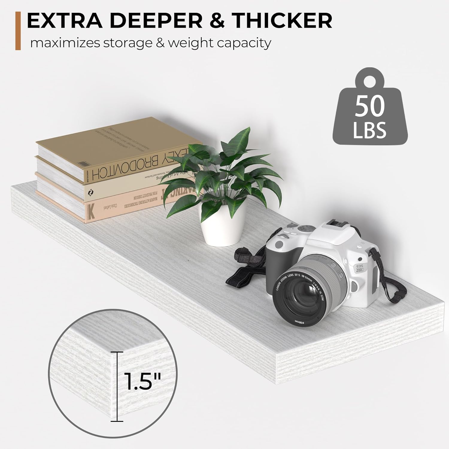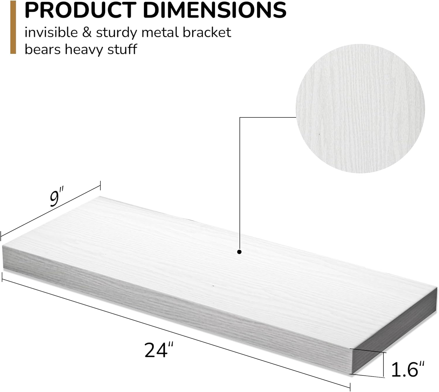 - Extra Deeper & Thicker - Each board measures 24"W x 9"D x 1.6"H. Extra deeper and thicker design in order to bring maximizes storage space and weight capacity, even hold up to 50 lb each. This floating shelf taking up zero square feet, reduces clutter and highlights décor in compact spaces.