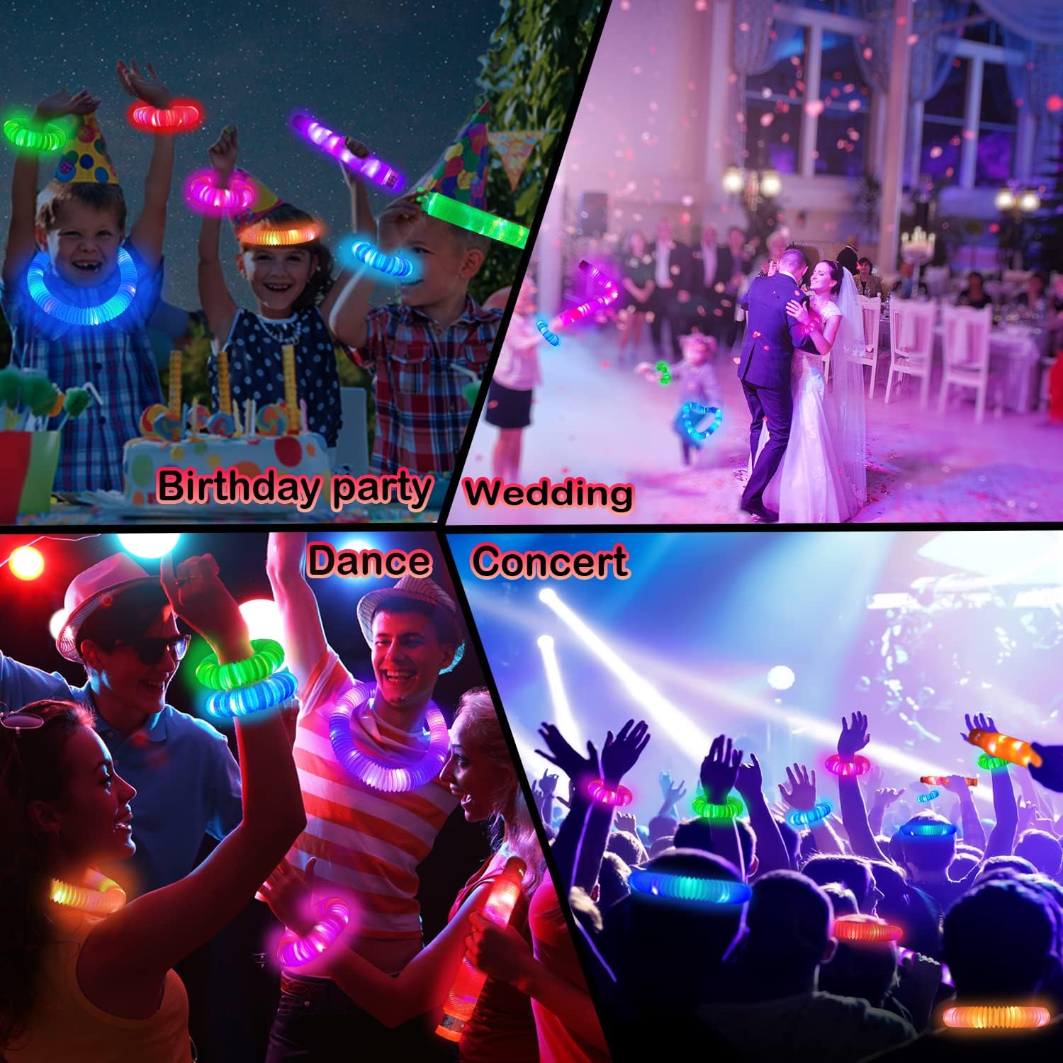 - Glow Sticks Bulk - Includes 24 unique glow sticks in 6 colors: green, red, blue, pink, orange, and purple. Perfect for lighting up the night!