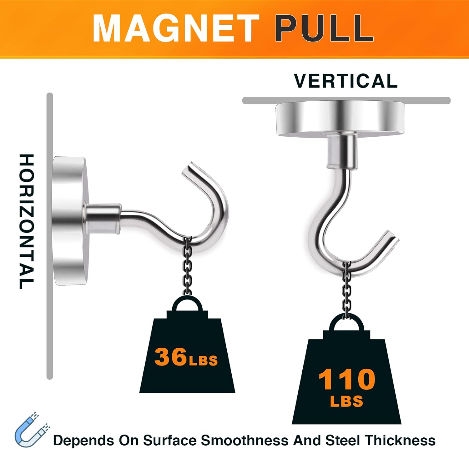 - 【Premium Magnetic Hooks】- Ni+Cu+Ni Triple Layer nickel coating greatly reinforces corrosion resistance. The best coating available, which provides a shiny and rust resistant coated steel cup provides protection for the heavy duty metal magnetic hooks and helps to prevent chipping or cracking, Safe to Use!