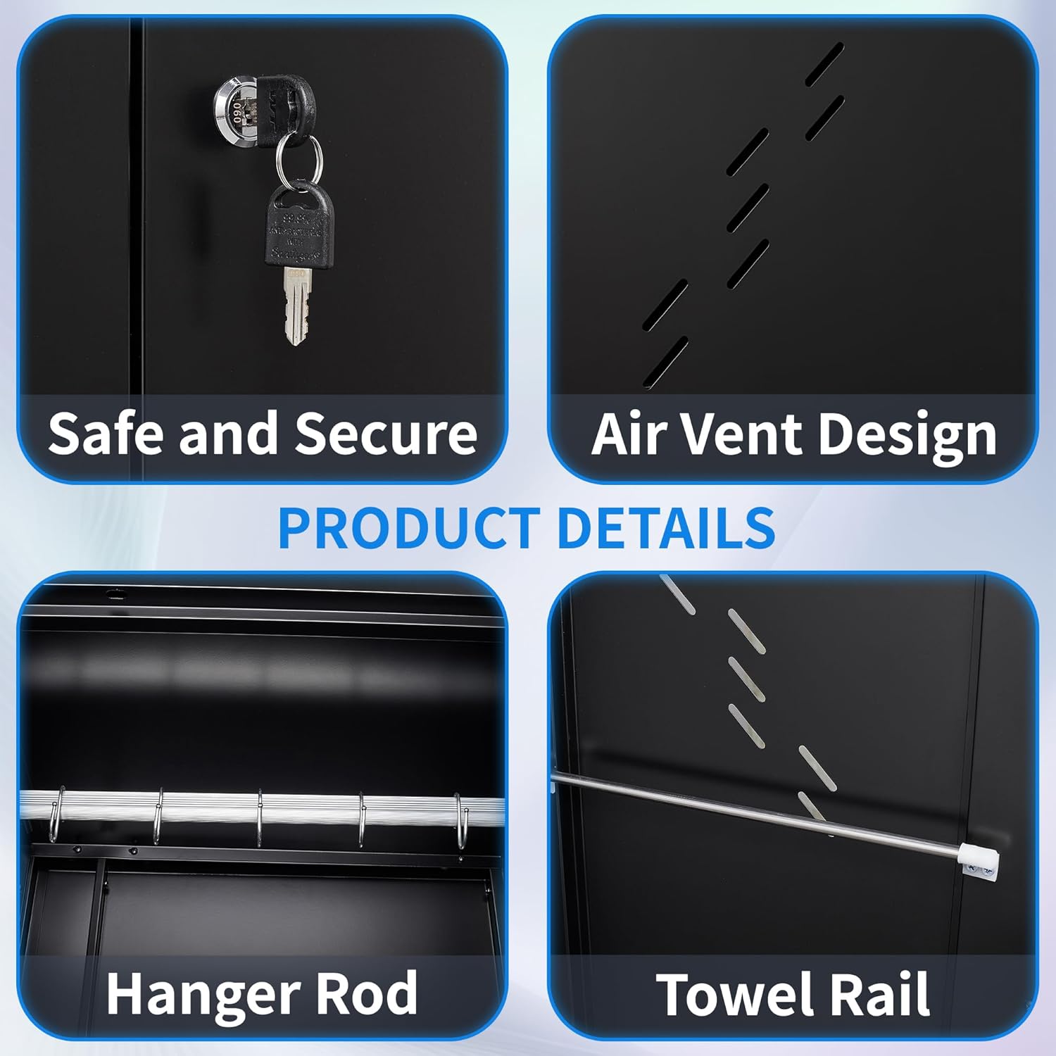 - 【Spacious Storage】-Our Metal Storage Cabinet with Locking Doors provides ample room for a variety of items with its three shelves and hanging rod. Whether you need a garage storage cabinet, tool cabinet, bathroom cabinet, laundry cabinet, ski cabinet, snowboard cabinet, utility cabinet, or cleaning supply storage cabinet, this versatile storage solution has you covered. With more vertical space than other products, you can store sundries, mops, fishing rods, snowboards, and other miscellaneous items conveniently.