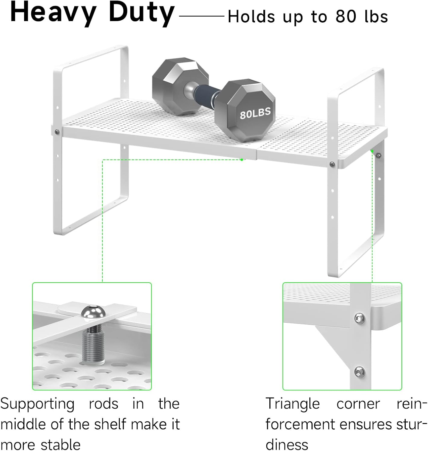 - Heavy-Duty: This pantry organizer, made of high-quality metal steel, has a load-bearing capacity of over 80 lbs. The coated layer makes the surface smooth, easy to clean, and rustproof. The anti-slip pads on the bracket prevent slip and ensures the shelf will stay in place.