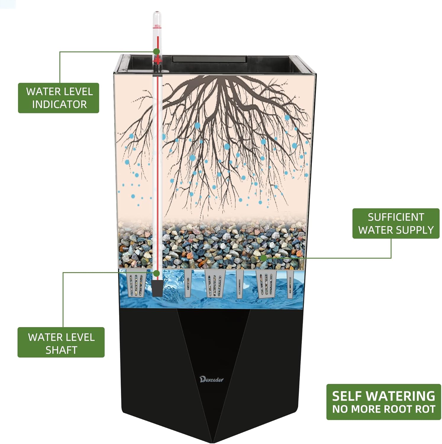 - SELF WATERING & NO MORE ROOT ROT - The smart unique sub-irrigation system is one of the most appealing aspects among all Dexceder planters. The easy-to-use separated integrated water reservoir or catcher- keeps your soil well aerated and automatic supplies plants with the right amount of ongoing moist air & nutrition for optimal growth. The insert indicator shows you the exact time to water again. The full water supply period can single-handedly last over 1 month based on different live plants