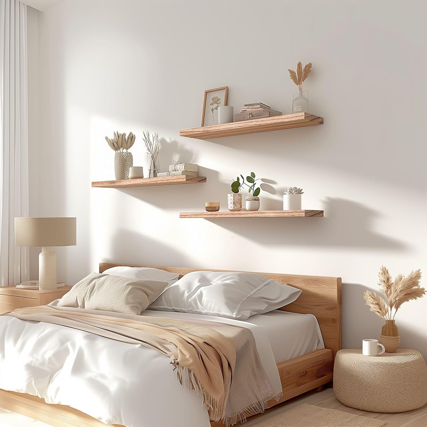 - Home decor and storage shelves - This wall shelves are the perfect piece for any rustic, modern, or natural home decor. They allow to better organize spaces, helping you conveniently store everything from alarm clocks, books, pictures to potted plants.