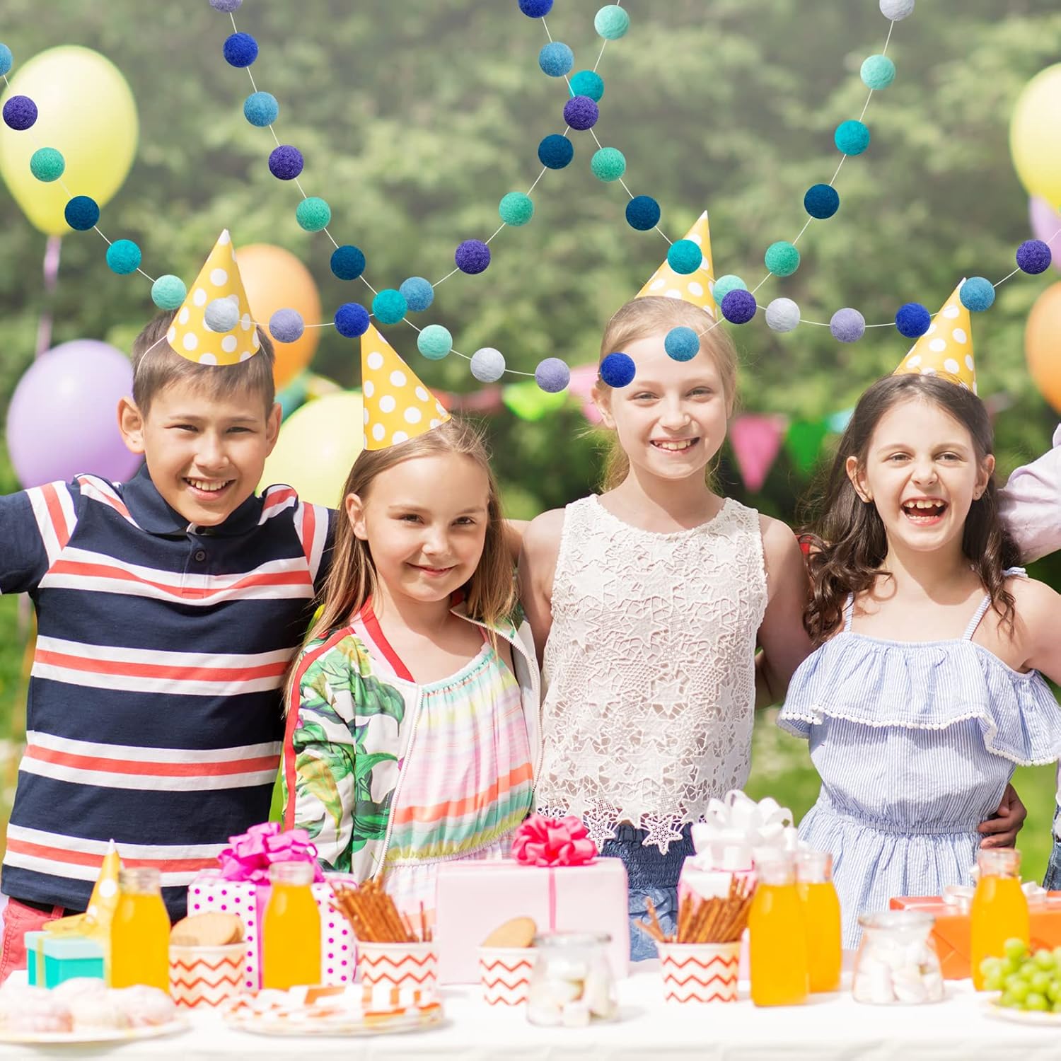 - Pom Pom Garland: This garland is made with 20mm felt balls. 36 balls are hand-stitched to the string. ▶▶Balls are NOT in fixed position in the garland.