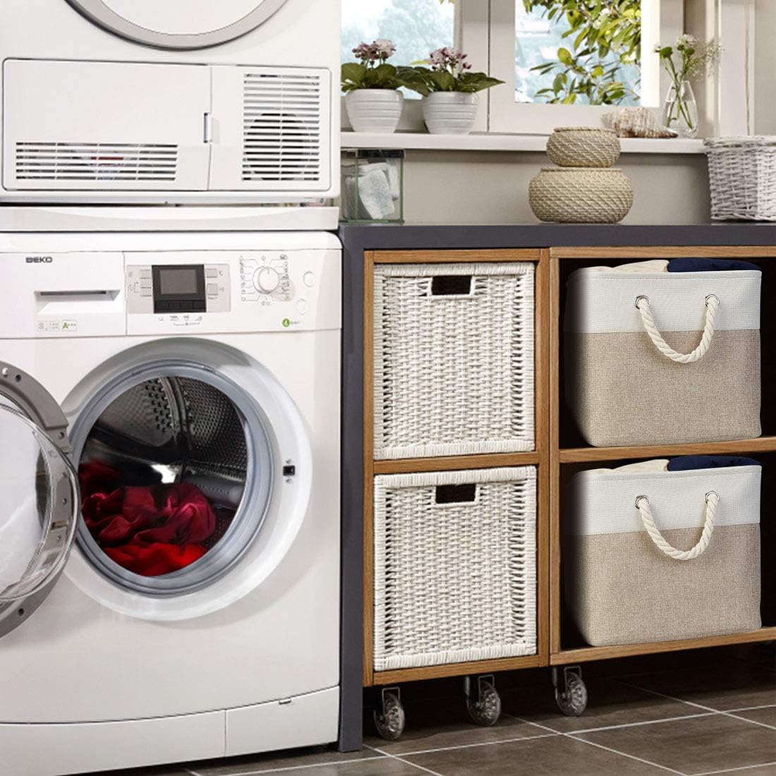 - Canvas basket storage bins are constructed of fabric with a sturdy base and thick rope handles for easy to carry or pull off and out of shelves. These storage baskets are tough enough to hold whatever you throw in it