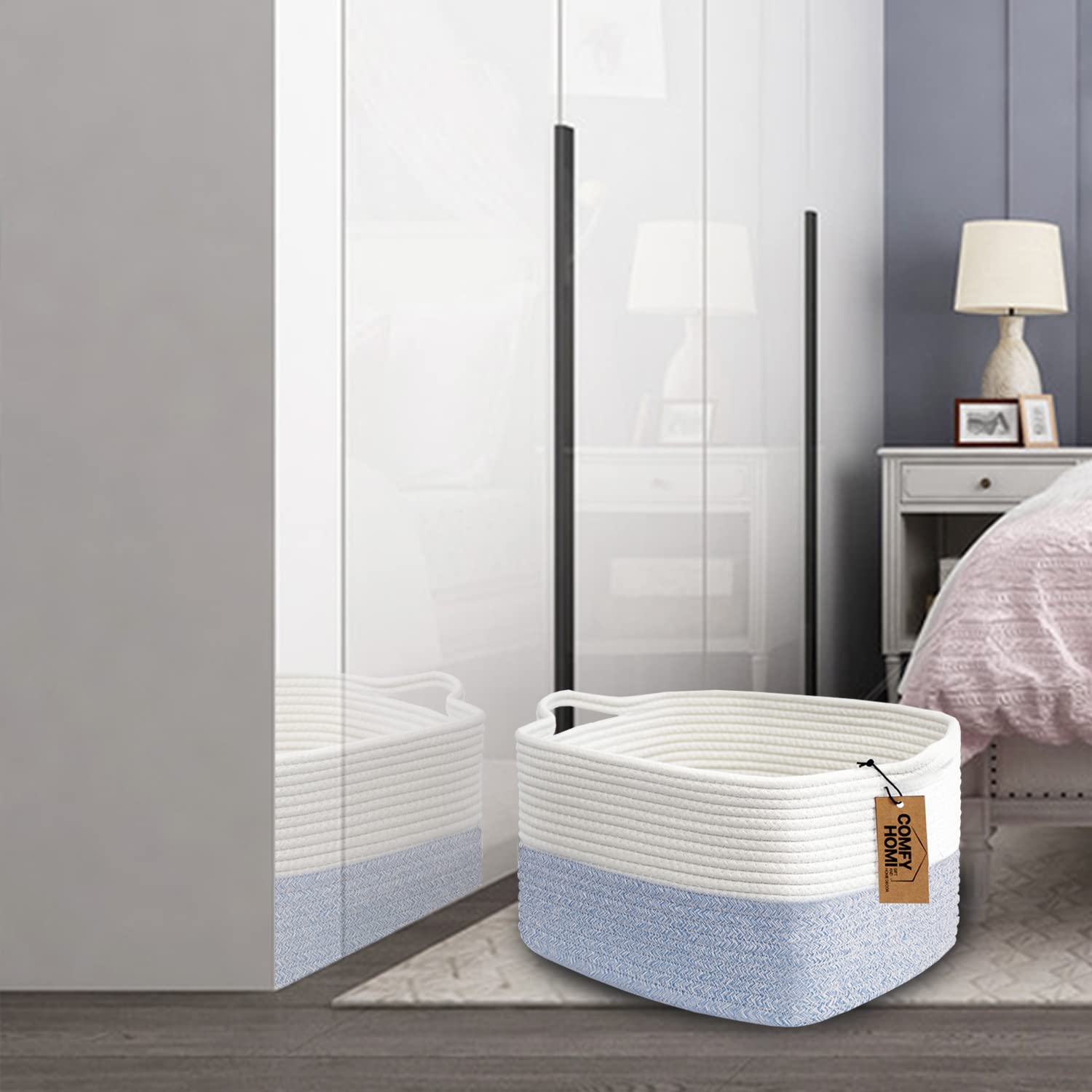 COMFY-HOMI Cotton Rope Woven Basket with Handles for shelf,Toy, Book, Cloth Storage Basket for Organizing-13.5"X11"X9.5" Storage Bin for Living Room, Newborn or Infant Gift for boy girl (White/blue)