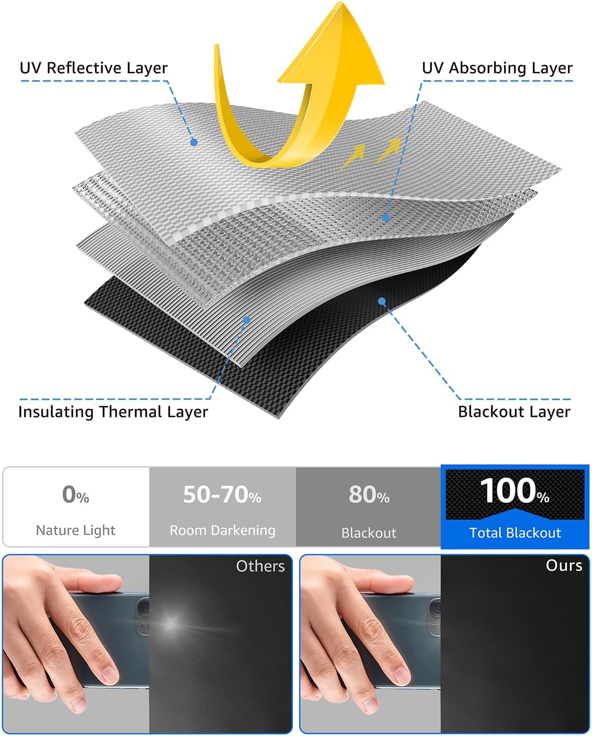 - 【Easy to Cut】75"x59" blackout window blinds, because of the special material, you can easily cut the curtains into the shape you want to perfectly match different shapes of curtains. It is recommended to cut the size slightly larger than the actual size of the window for a better shading effect