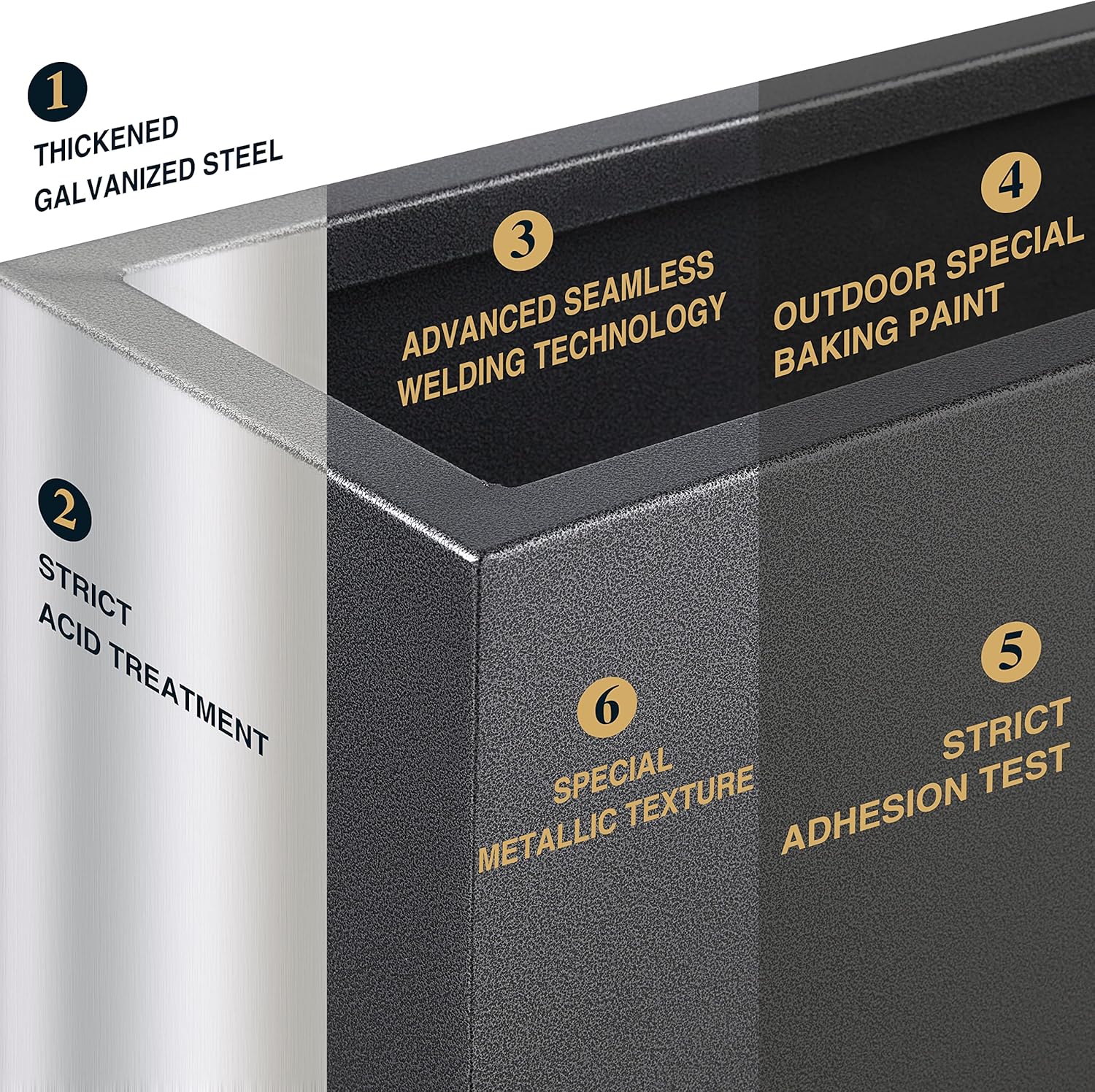 - 【No Assemble and Seamless】Our flower box arrives fully assembled and requires no additional setup. Simply unpack and place it in your desired location for instant use, saving you time and effort. Crafted using advanced fully automatic welding technology, this flower box features a seamless, one-piece design with a smooth and even surface, ensuring long-lasting durability and a polished appearance.