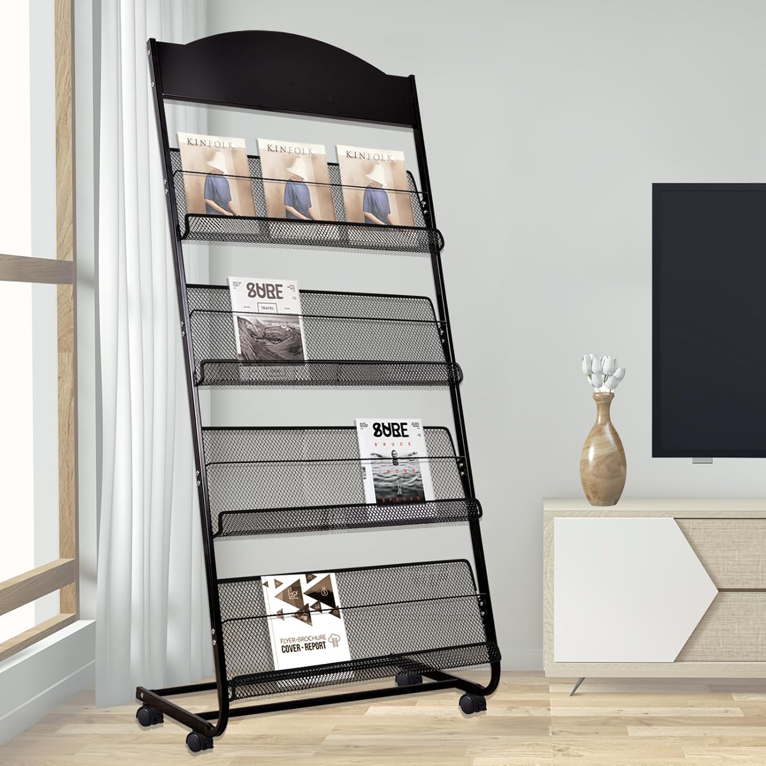 - 【SCIENTIFIC STRUCTURE DESIGN】The steel mesh design of this magazine rack can promote air circulation, reduce dust accumulation and keep the overall neatness. This magazine stand has universal brake wheel, can rotate 360 degrees, flexible movement, wear-resistant and silent, and the brake does not slip