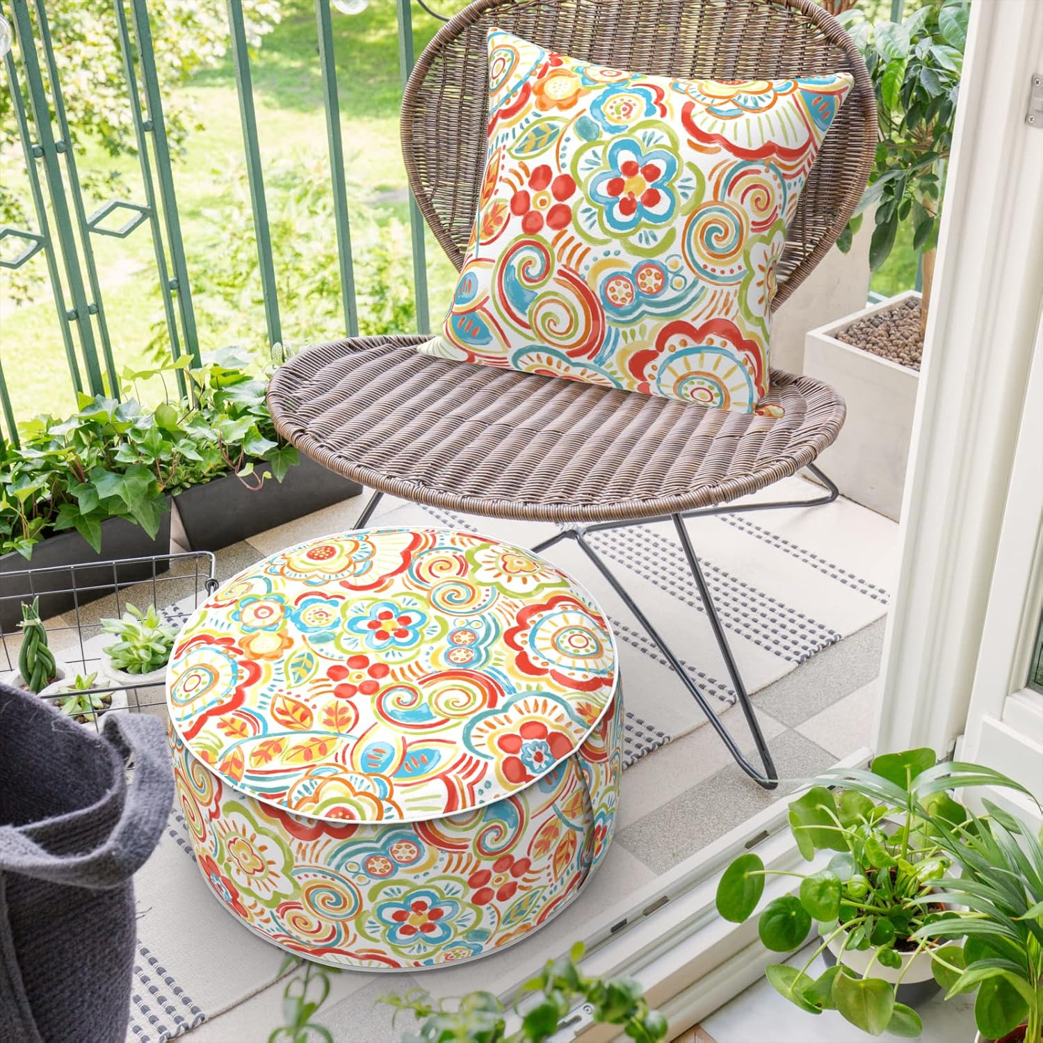Inflatable Ottoman Stool D21 xH9 for Outdoor/Indoor Use, Water Repellent Patio Foot Rest Stool with Portable Handle,Round Pouf Ottoman Suitable for Garden,Deck and Camping - Flower Red