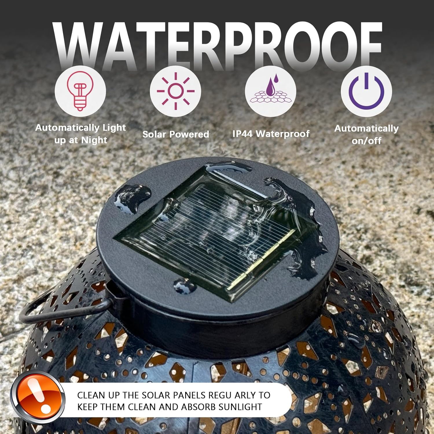 - Dusk to Dawn Auto ON/OFF: During the day, the solar panel converts sunlight into electricity and recharge the battery. At night, the solar lanterns turn on automatically from the electricity stored during the day.Bright LED lights last for at least 8 hours at night.