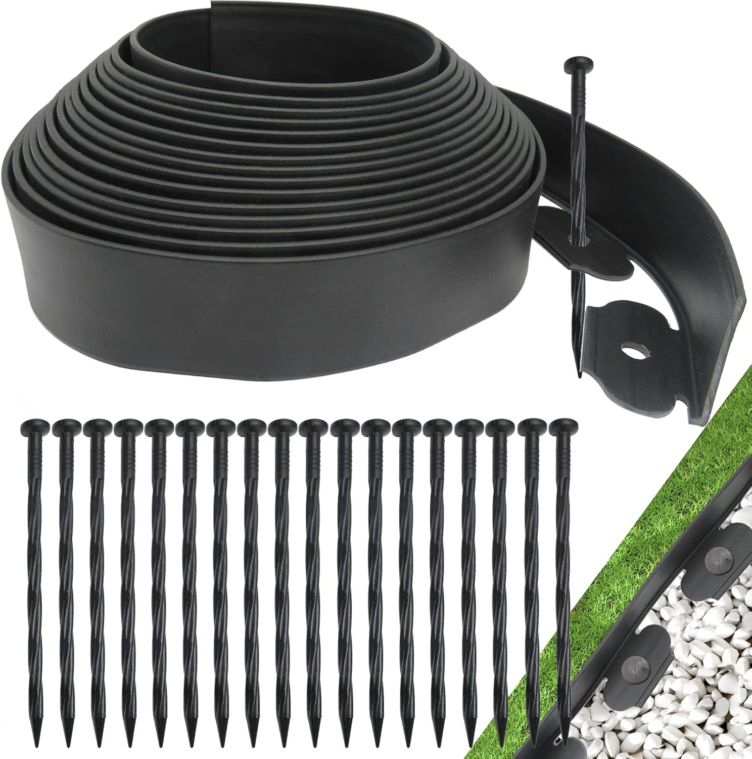 - 【Product Dimensions】The rubber landscape edging kit, includes a 66 ft. coil of landscape edging, black,2inch tall and 90pcs stakes and 1 metal stake.
