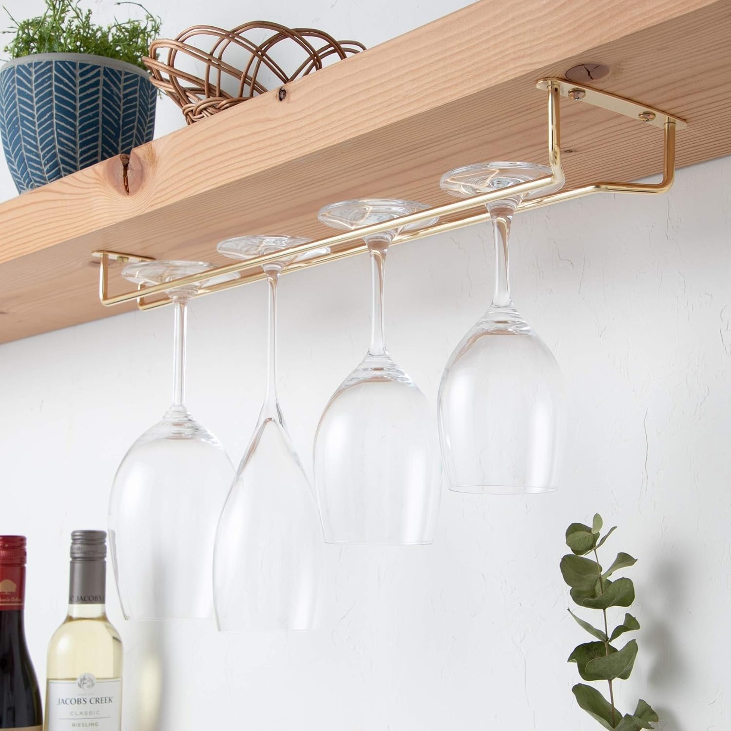 - Crafted from polished brass, this under-cabinet wine glass rack blends durability with contemporary charm. Its sleek finish and modern design add an elegant accent to your kitchen, home bar, or dining space. Built to withstand daily use, this stemware holder is easy to maintain and designed for long-lasting style and functionality.