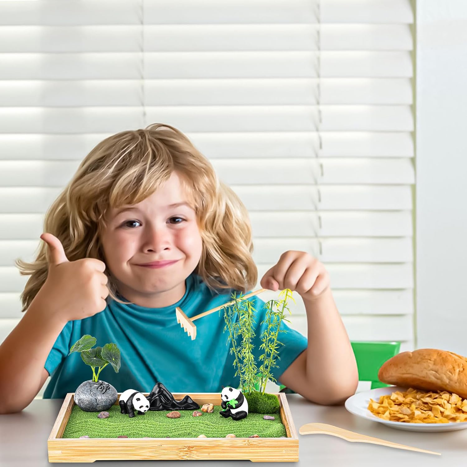 Zen Garden Kit for Desk 11''x7.5'' Room Decor with Green Sand, Panda Decorative Ornaments, Haystack, Ceramic Mountain, Stones and Rakes (Panda Bamboo)