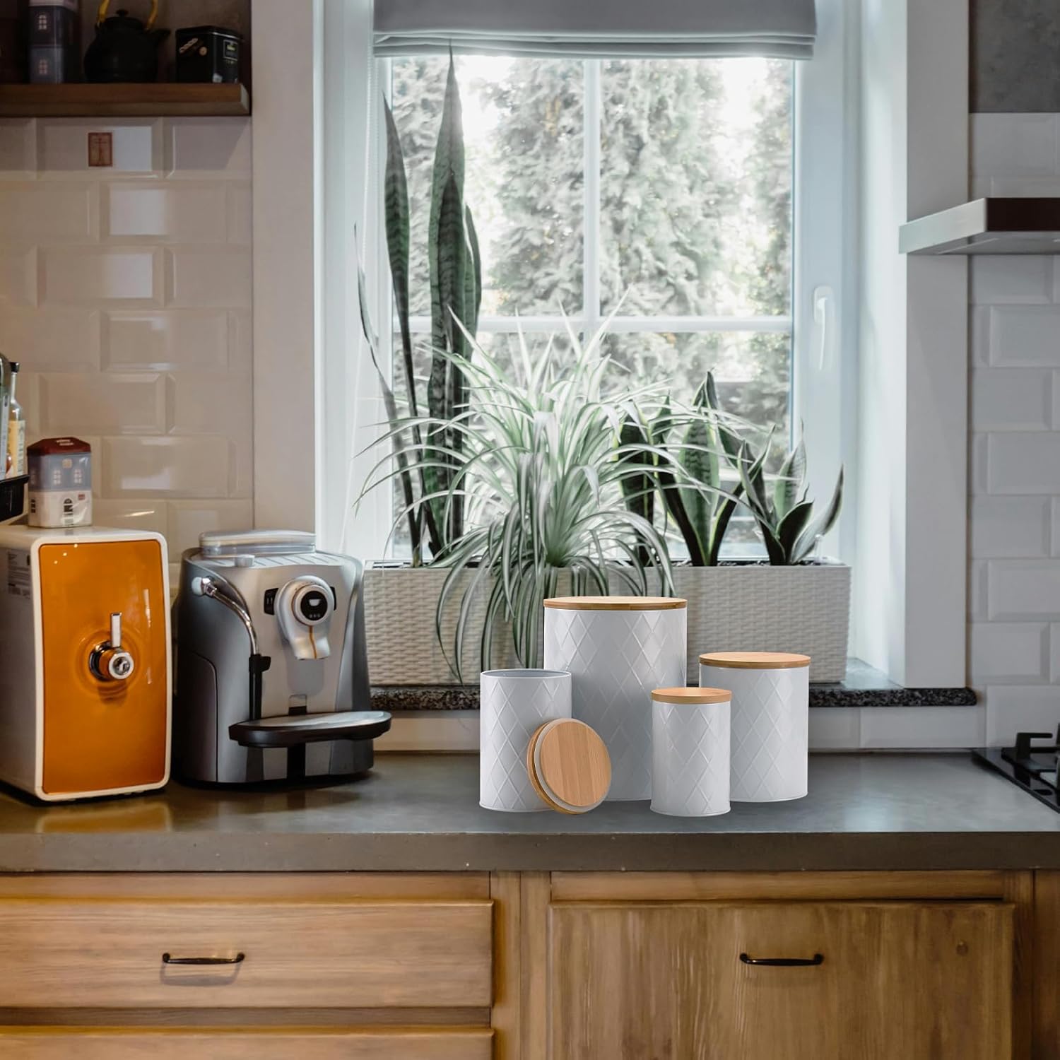 White Kitchen Canisters Set with Bamboo Lids, Airtight Sugar, Flour, Coffee, Cookie Storage Canister Sets for kitchen Countertop, Farmhouse kitchen decor, 4 Pack