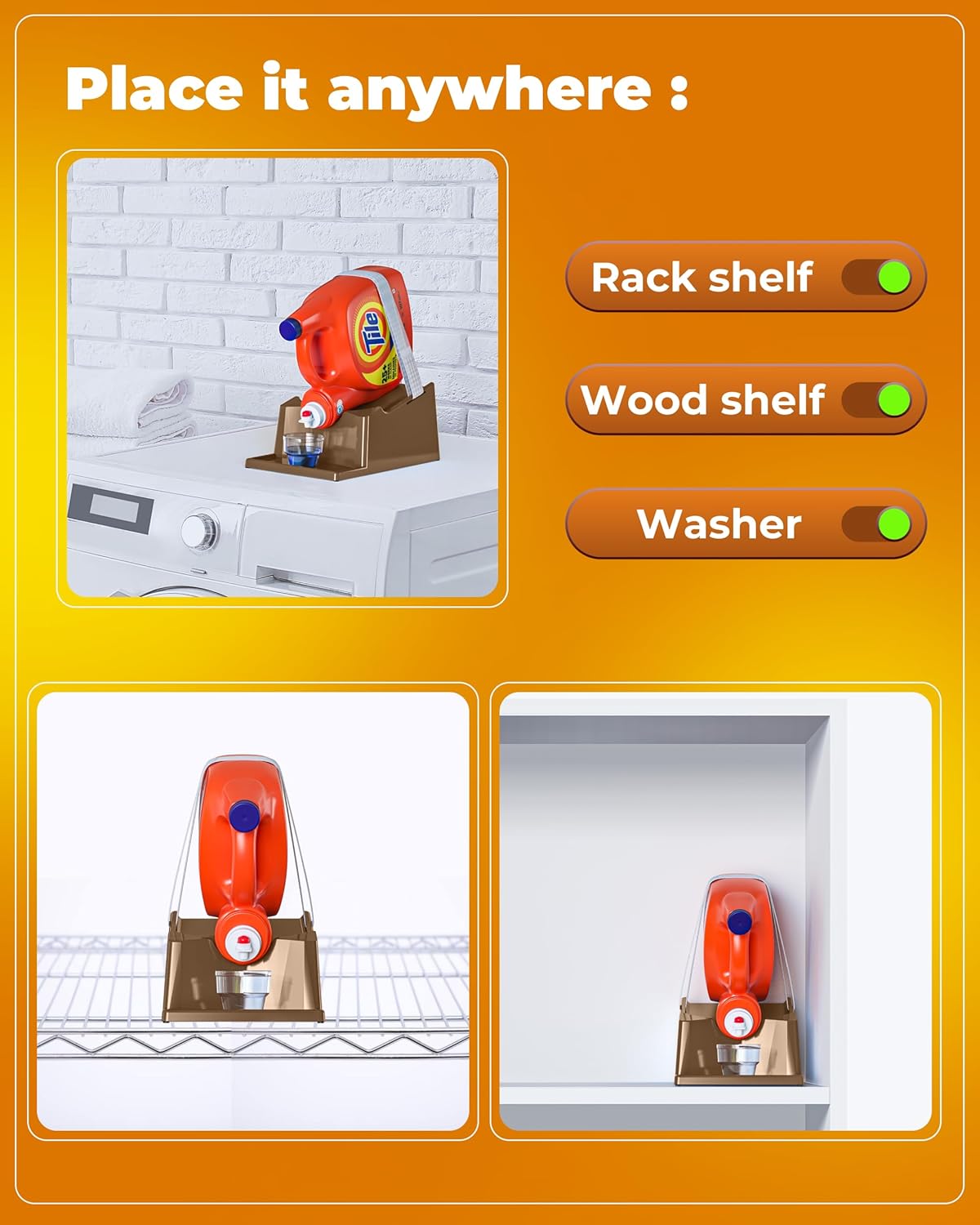 - [Safe Attachment:] The laundry detergent shelf or holder features a secure strap that firmly attaches and ensures your detergent bottle stays in place and minimizing the risk of accidental falls and spills.