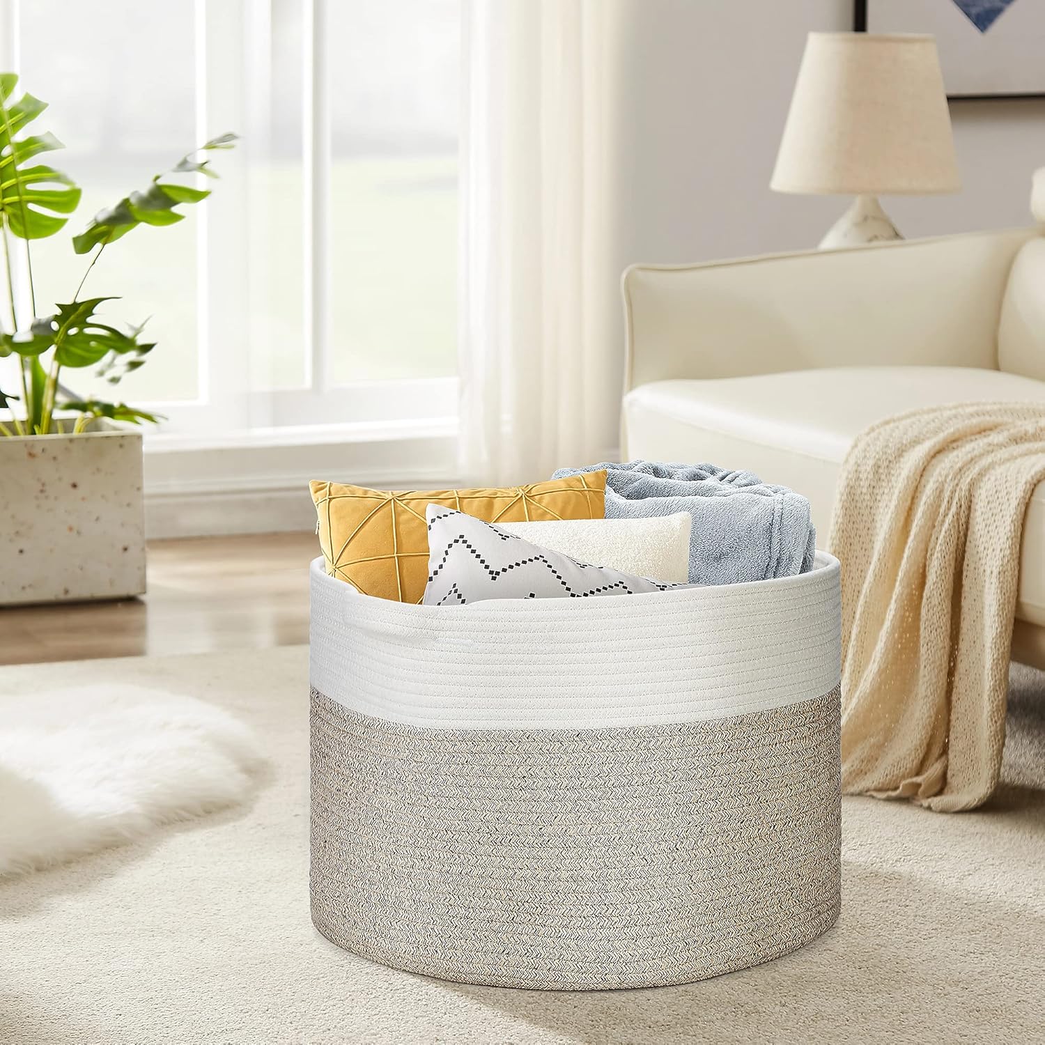 Ravinte Blanket Basket - 20"x 20"x 13" Cotton Rope Basket for Living Room, Baby Toy Storage Basket, Large Woven Laundry Basket (White-Light Brown)