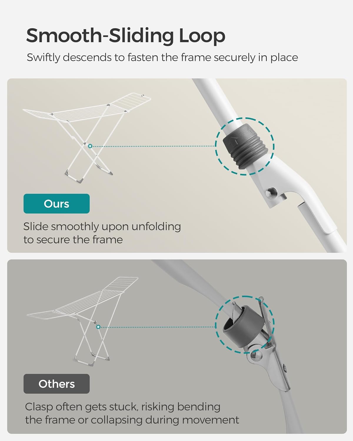 - [Thoughtful Details] This drying rack features a smooth-sliding loop, a plastic clip that keeps wings securely in place when folded, and floor-friendly plastic feet