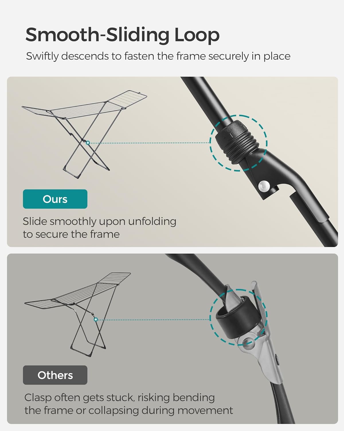 - [Thoughtful Details] This drying rack features a smooth-sliding loop, a plastic clip that keeps wings securely in place when folded, and floor-friendly plastic feet